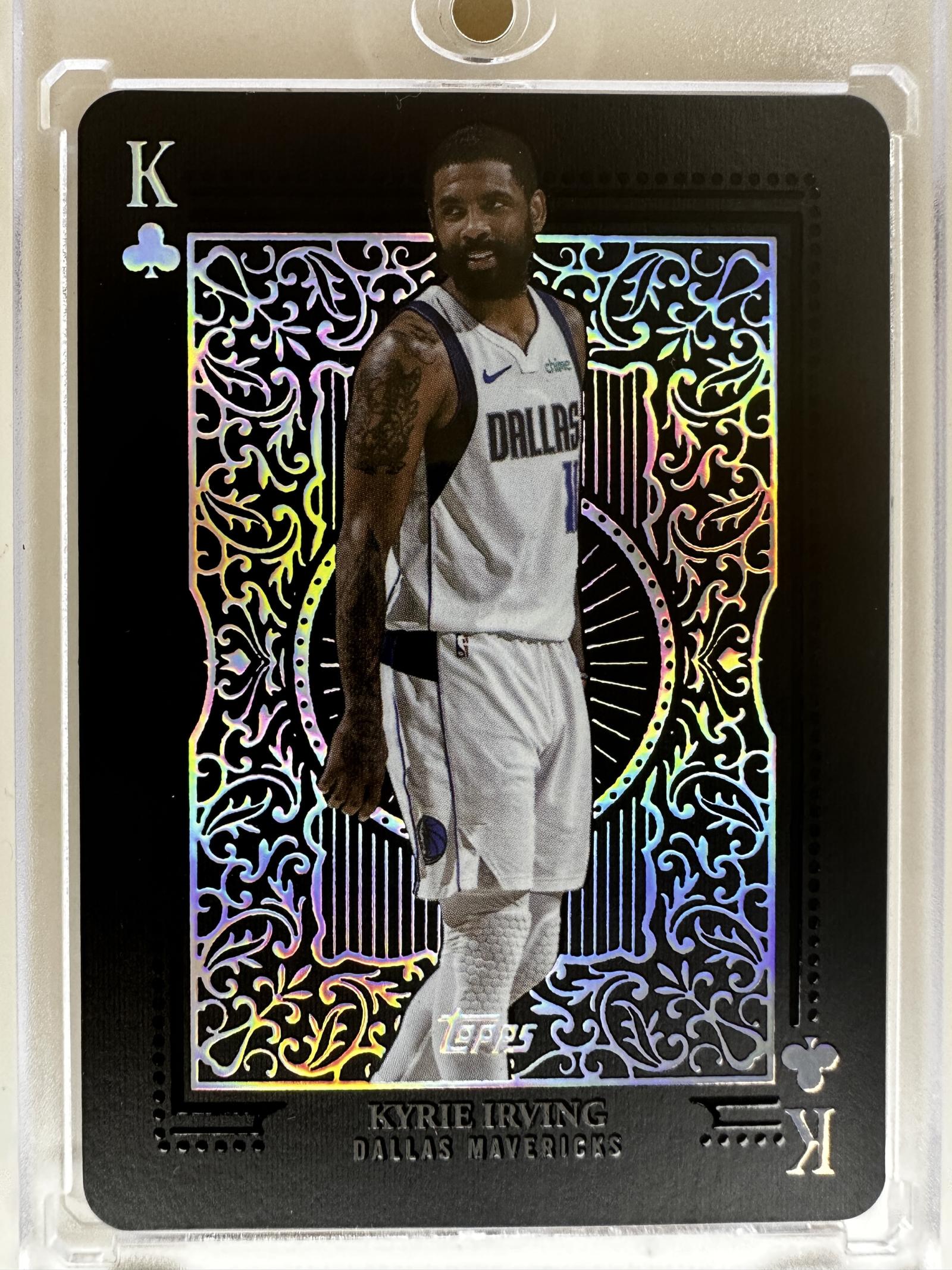 Collectible value & appeal: This is a modern insert featuring Kyrie Irving in his Dallas Mavericks uniform — a high-interest player and a popular insert for both team and player collectors. As an ungraded near-mint insert with heavy foil treatment and an eye-catching playing-card theme, it’s well suited for display, set-building, or future grading. Because it’s an All Kings insert (not a base card), it carries stronger collectible/desirability appeal than typical base parallels, especially for fans of Kyrie or specialty insert collectors.