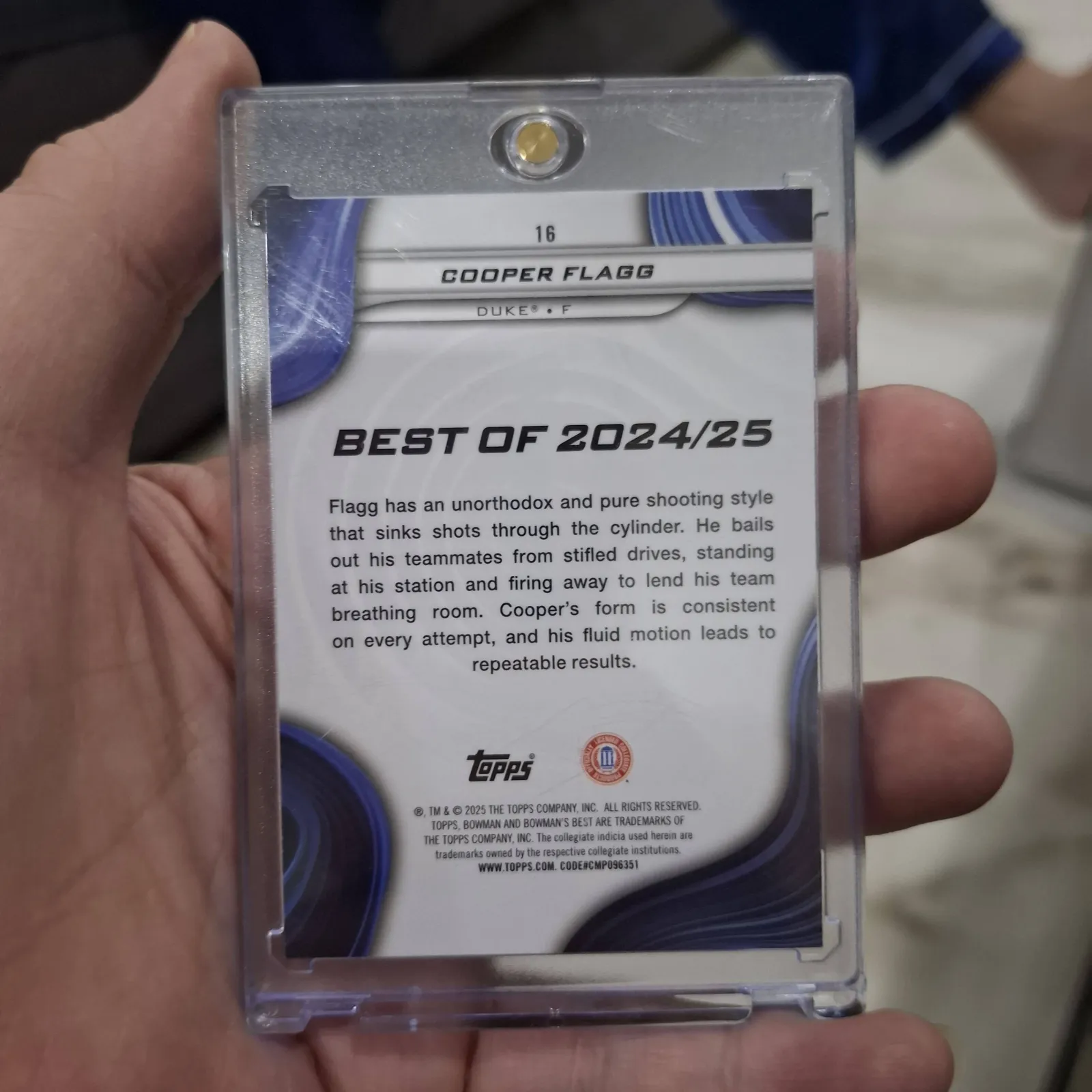 A Panini Prizm Draft Picks basketball card featuring Cooper Flagg from Duke University. The card is encased in a protective plastic holder. The card shows vibrant graphics with a clear image of Cooper Flagg in his Duke uniform, holding a basketball. It is suitable for collectors of college basketball cards.