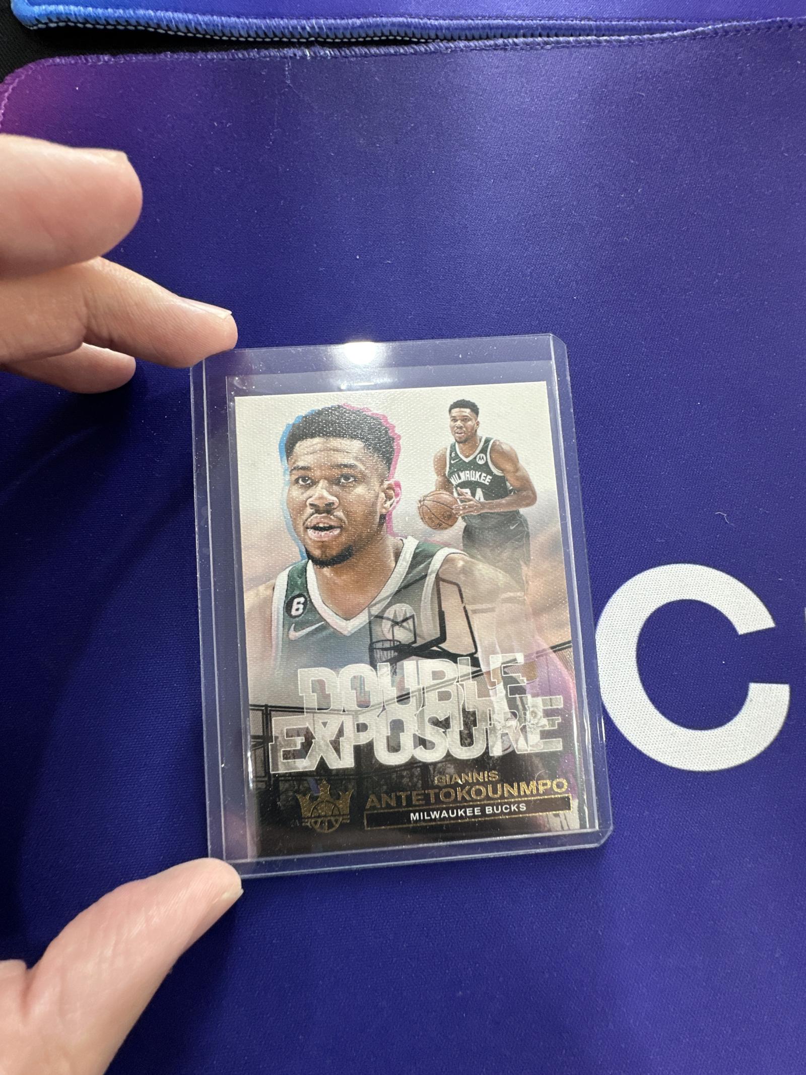 This basketball card features Giannis Antetokounmpo of the Milwaukee Bucks in a 'Double Exposure' design. The card is protected in a plastic sleeve and showcases two images of the player, highlighting his dynamic presence on the court. A great collectible for any fan of Giannis or the Bucks.