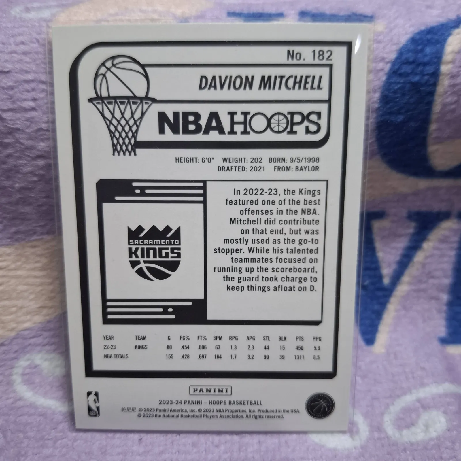 This NBA Hoops basketball card features Davion Mitchell of the Sacramento Kings in action during a game. The card showcases vivid colors and sharp imagery, representing a great collectible for fans and card collectors.