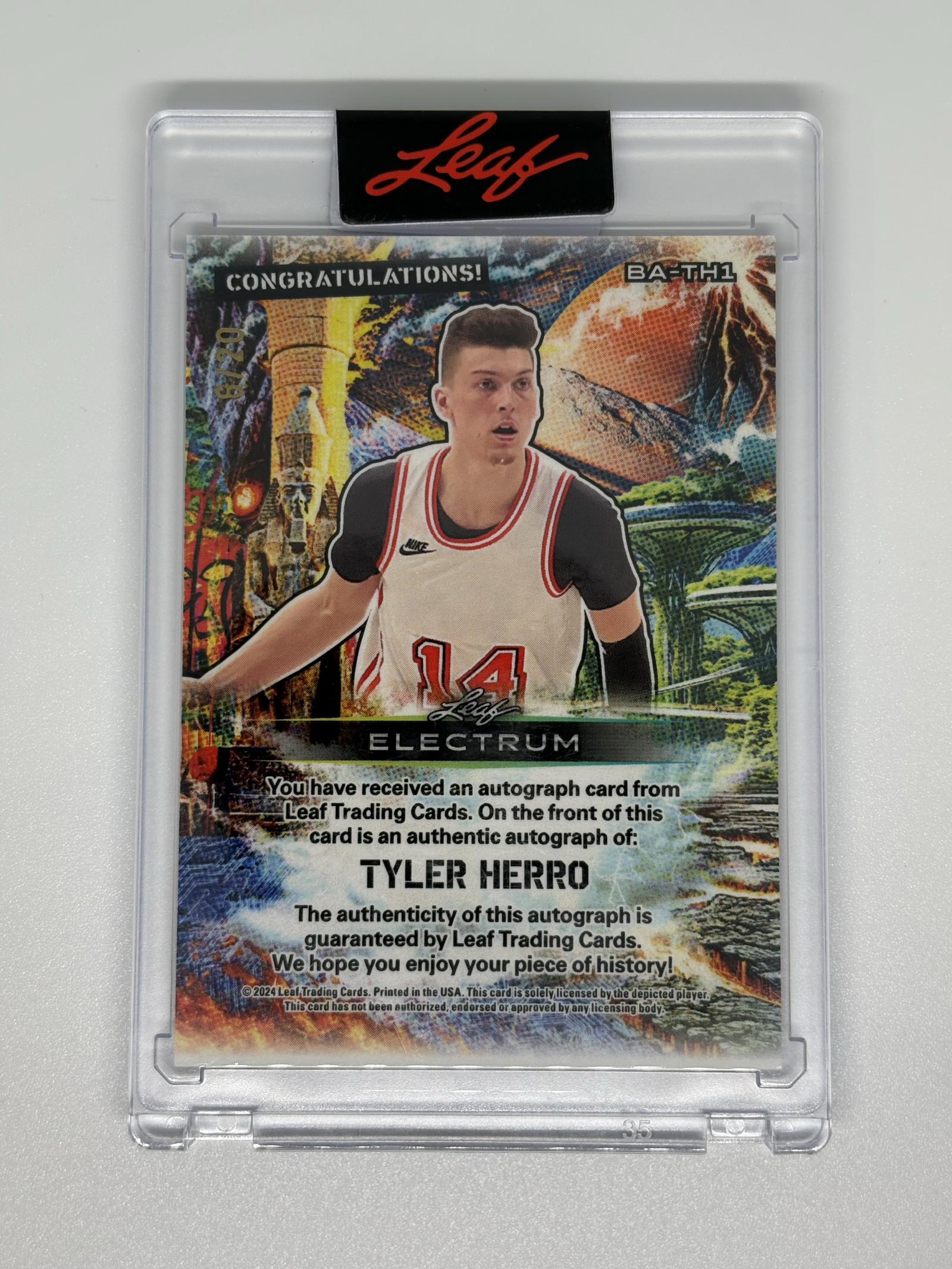 This is a Leaf Electrum autograph card featuring NBA player Tyler Herro. The card has authentic player autograph guaranteed by Leaf Trading Cards. The back of the card has the card number BA-TH1 and states its authenticity. The card is from the 2024 Leaf Electrum set, made in the USA. This card is a collectible basketball trading card, not related to Pokemon TCG.