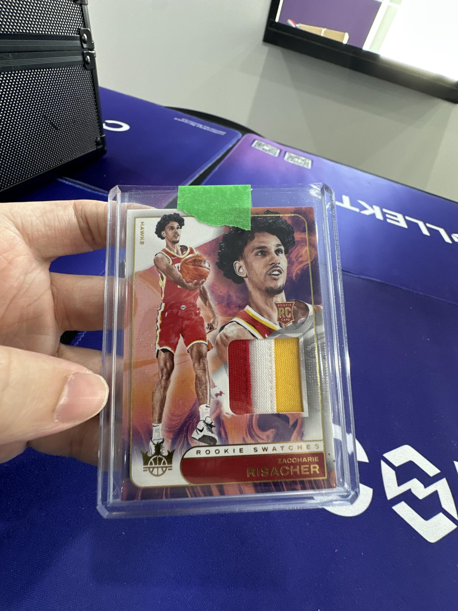This Zaccharie Risacher rookie card features a multi-color jersey patch securely encased in a protective plastic holder. The card highlights Risacher in action and includes a clear Rookie Card (RC) badge, making it a valuable addition for collectors interested in up-and-coming basketball talent.