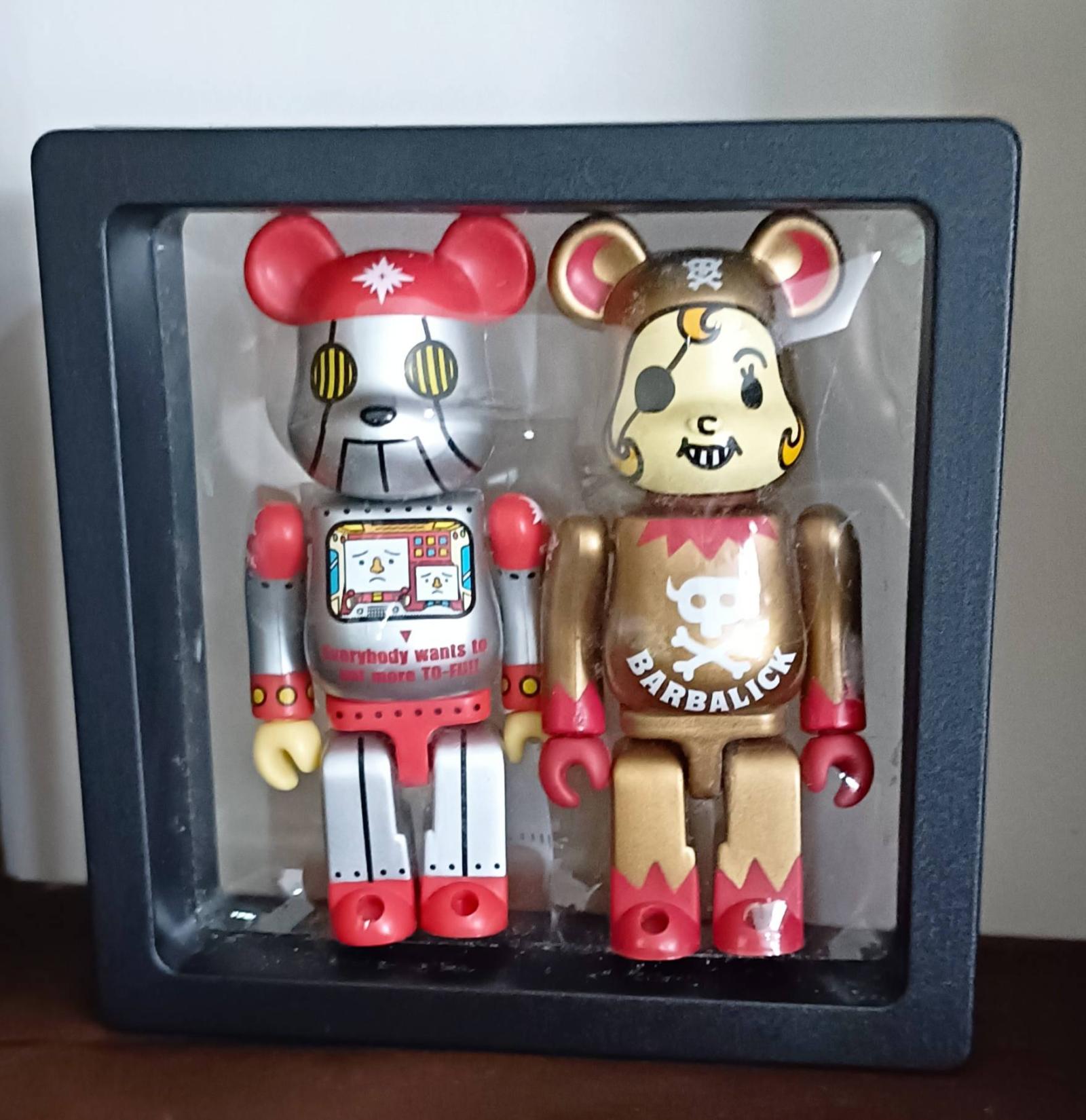A collectible set of two 100% scale BE@RBRICK figures by Medicom Toy. The first figure features a robot design with a red and silver color scheme and detailed screen graphics. The second figure is a gold and red pirate-themed Barbalick bear with an eye patch and skull motif. Both figures are displayed in their original clear plastic case. Vintage and eye-catching for any Bearbrick collector or toy enthusiast. Opened with card