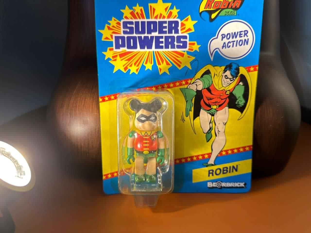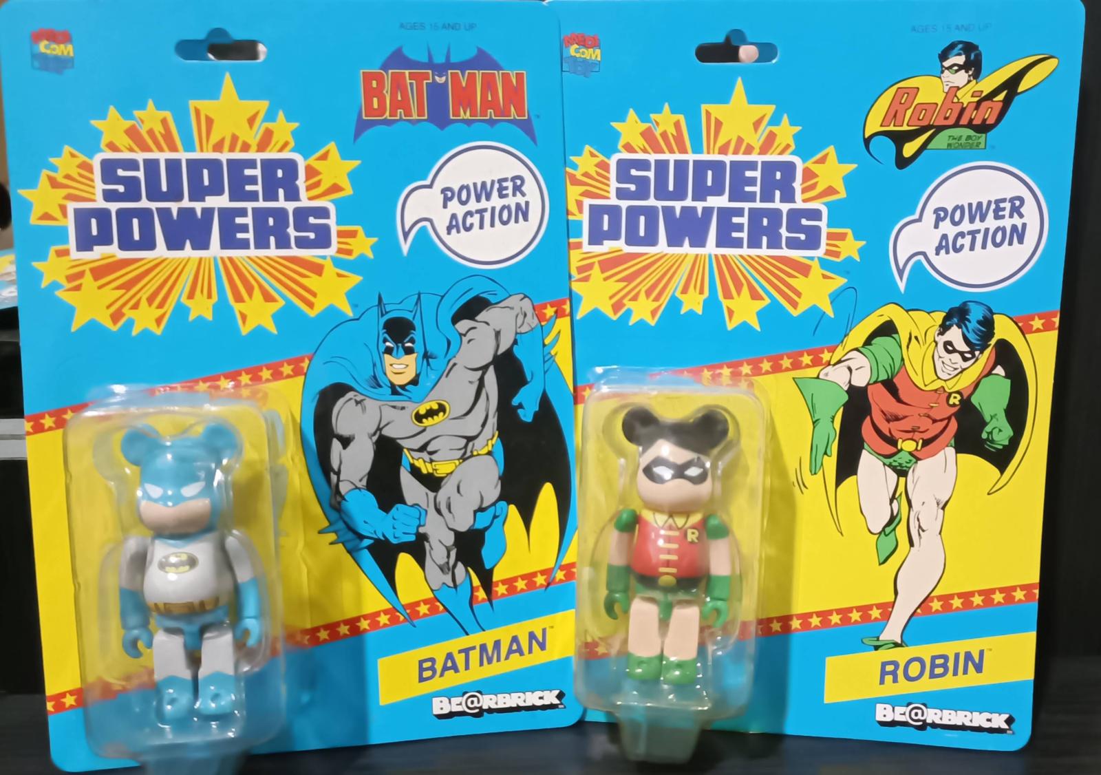 This set includes two collectible Bearbrick figures featuring Batman and Robin from the Super Powers series. Both figures are carded with original packaging that showcases vibrant artwork and Power Action branding. The blister packs are intact, and the figures are securely sealed inside. A great collectible for fans of Bearbrick and classic superhero figures.