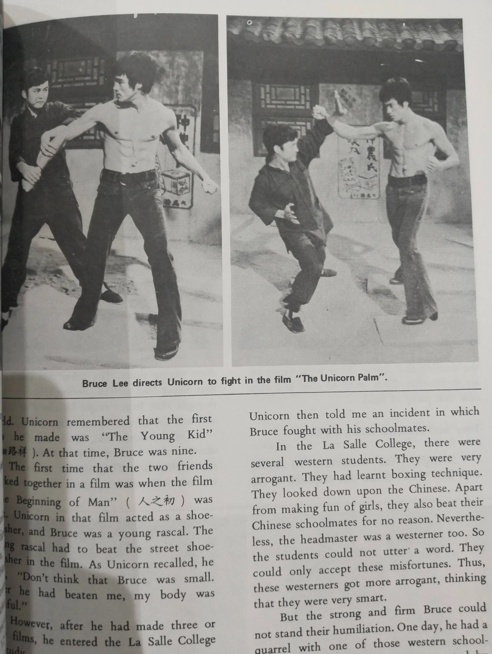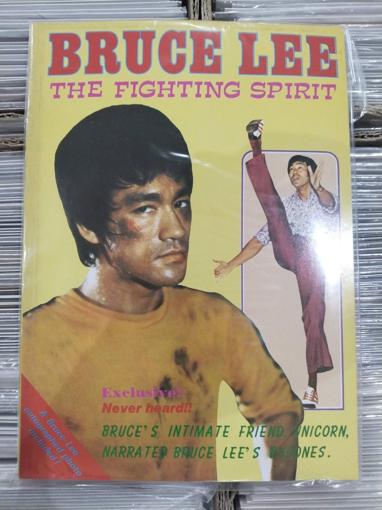 A rare collectible book titled 'Bruce Lee: The Fighting Spirit' featuring exclusive content narrated by Bruce Lee's close friend Unicorn. Includes an autographed photo of Bruce Lee. The cover displays notable wear with some visible scratches and smudges but the book remains intact and collectible.