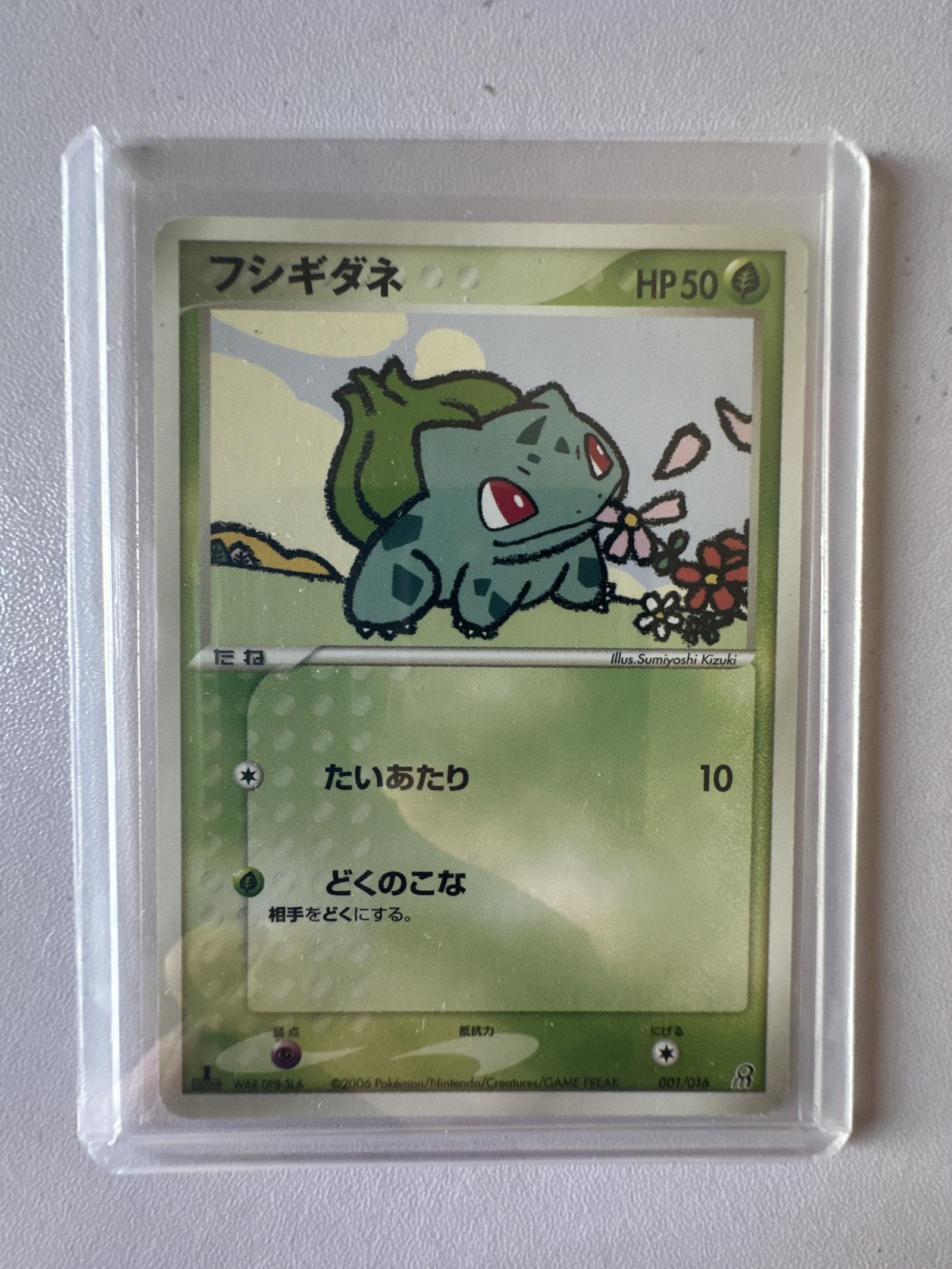 This is a 2006 Japanese Pokémon card featuring Bulbasaur (フシギダネ) with 50 HP. Illustrated by Sumiyoshi Kizuki, the card shows Bulbasaur with a flower in its mouth, set against a gentle nature-themed background. The card is well-preserved and encased in a protective sleeve, showing no visible damage or wear.