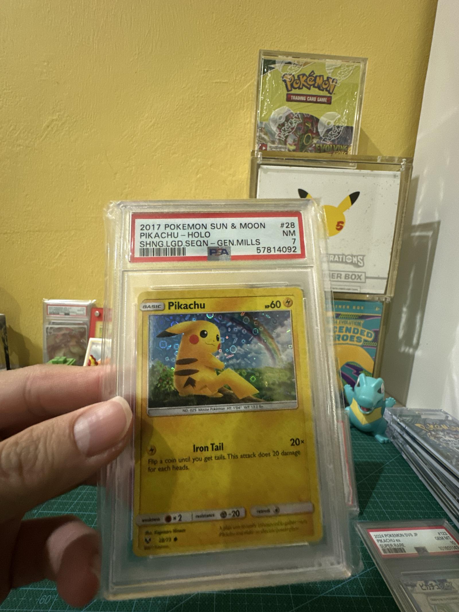 This is a 2017 Pokemon Sun & Moon trading card featuring Pikachu with a holographic effect. The card is graded by PSA as Near Mint (NM) with a score of 7. It comes secured in a protective hard case, ensuring its preservation and collectible value. A great addition for any Pokemon card collector or enthusiast.