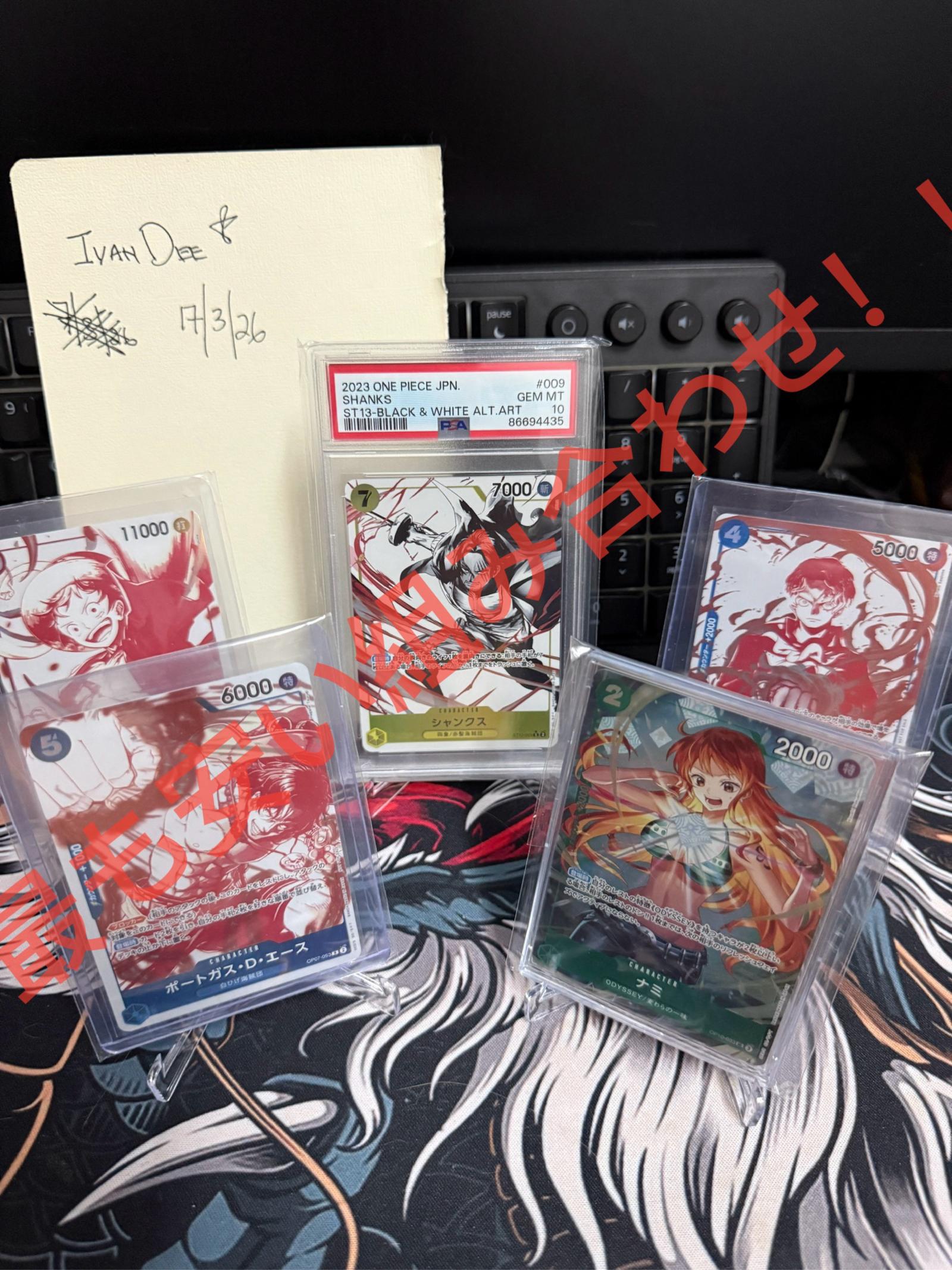 A collectible set of 2023 One Piece Japanese card game cards featuring characters like Shanks (PSA Gem Mint 10, Black & White Alternate Art), Portgas D. Ace, Nami, and others. Cards are presented in protective sleeves with one PSA graded card showcasing top condition. Perfect for One Piece fans and card game collectors.