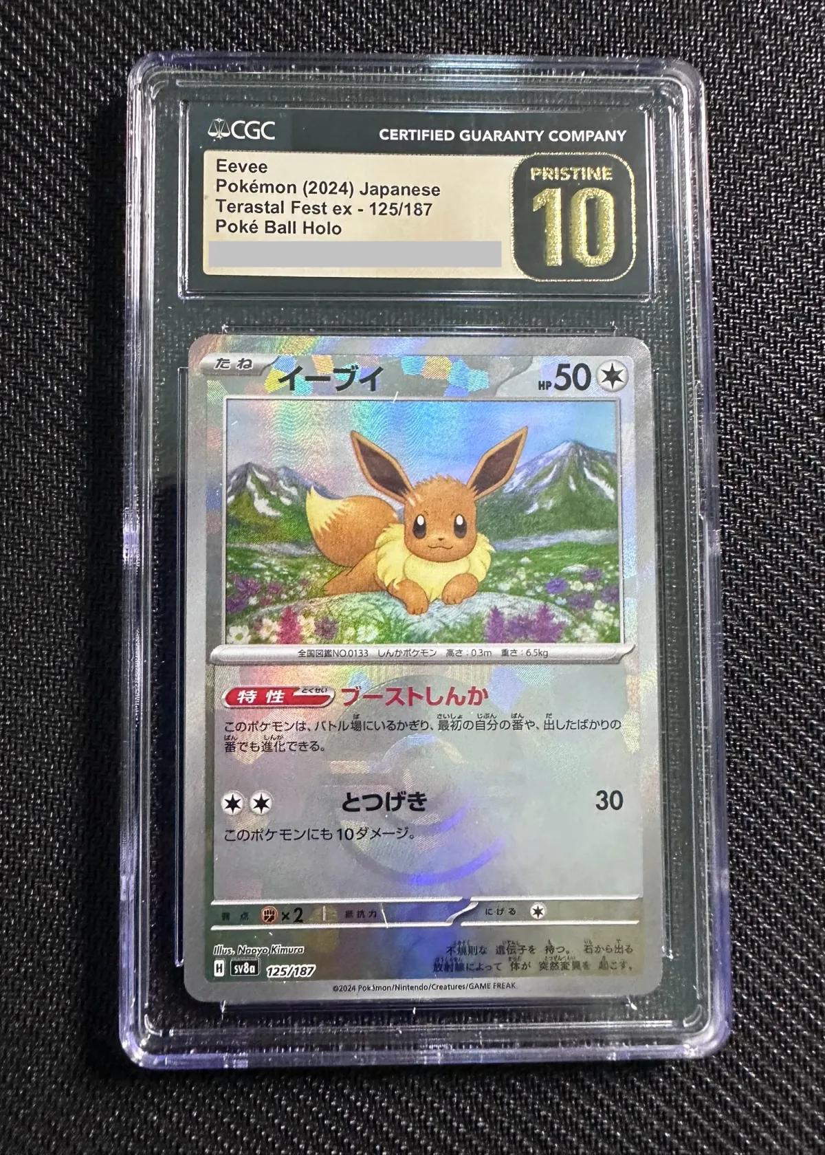 This is a graded Japanese Eevee card from the Pokémon 2024 Terastal Fest ex series, card number 125/187. The card features the stunning Poké Ball Holo pattern and has been professionally graded by CGC with a Pristine 10 rating, indicating top-tier quality and collectibility. Perfect for dedicated Pokémon TCG collectors or fans of Eevee, this card is beautifully presented in its certified slab.