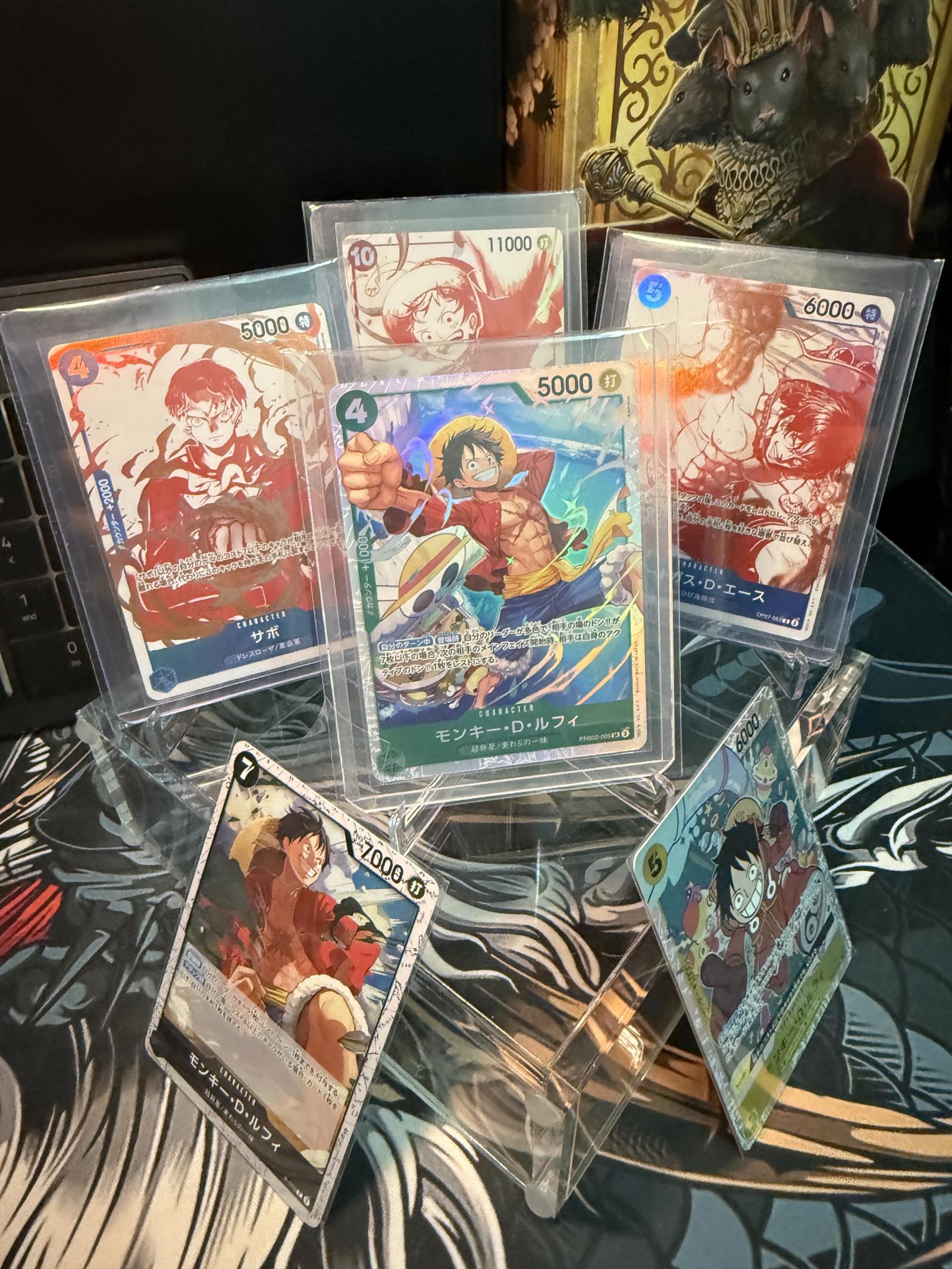 A set of collectible card-based board game cards from the One Piece series, featuring characters like Monkey D. Luffy, Sabo, Ace, and others. Cards are individually sleeved in protective plastic holders for preservation. Ideal for fans or collectors of One Piece and card games.