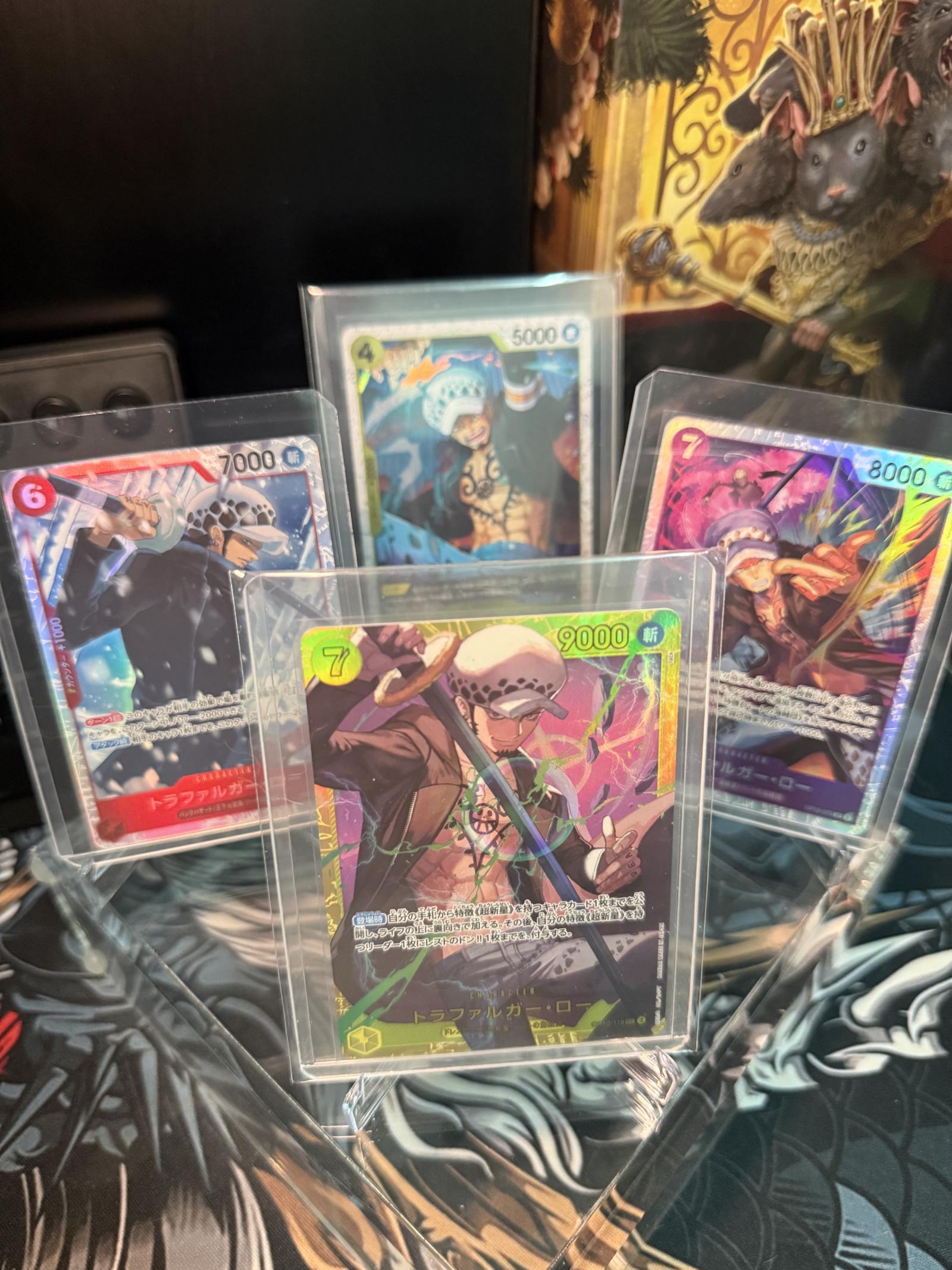 A set of four holographic Trafalgar Law character cards from the One Piece Trading Card Game. Each card features vibrant artwork and is protected in individual sleeves. The cards display varied power levels and special abilities, ideal for fans and collectors of the series.