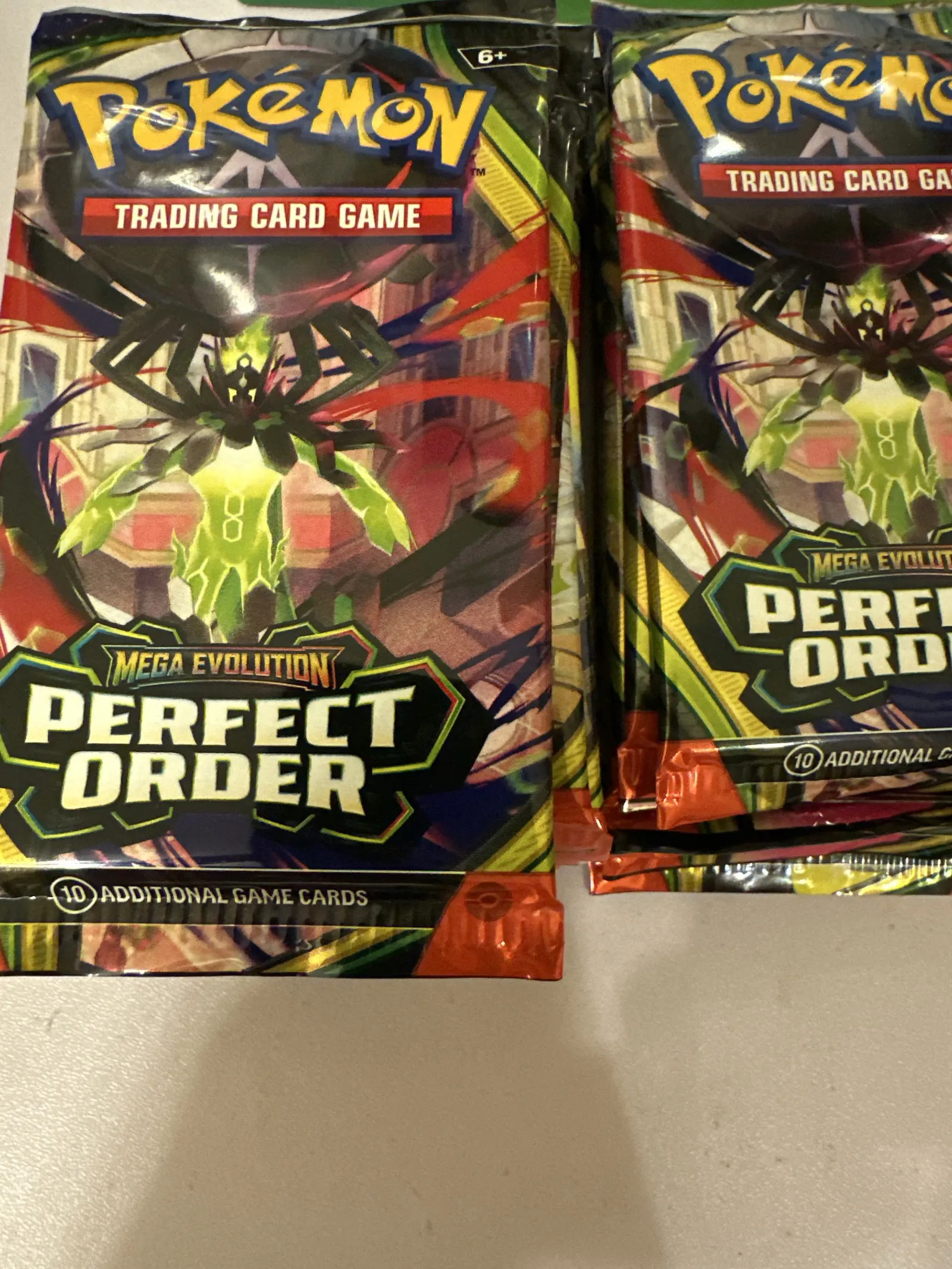 A sealed Pokemon Trading Card Game booster box from the Mega Evolution Perfect Order series. This box contains booster packs for card collectors and players looking to expand their deck with Mega Evolution themed cards. The packaging is unopened and features authentic Pokemon branding and security seals.