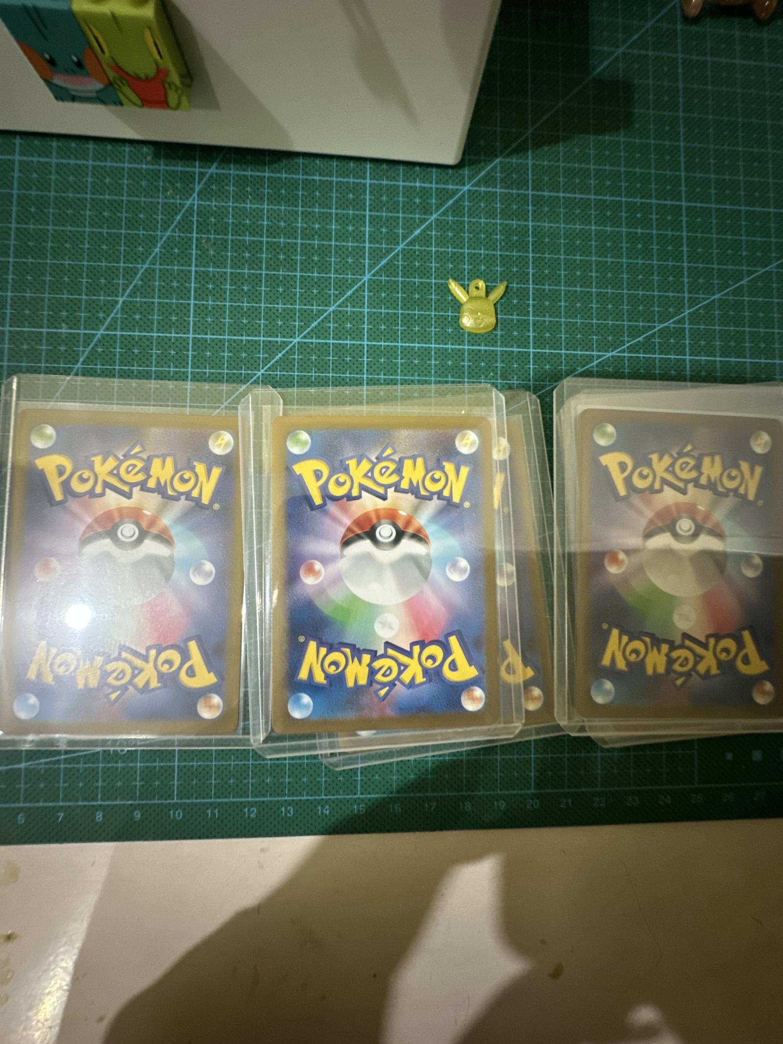 A collection of Pokémon trading cards displayed in protective sleeves, accompanied by a small gold-colored Pikachu charm. Cards are stored face down, showing the classic Pokémon card backs. The items appear well cared for with no visible major damage. Ideal for collectors interested in vintage or rare Pokémon card sets and related memorabilia.