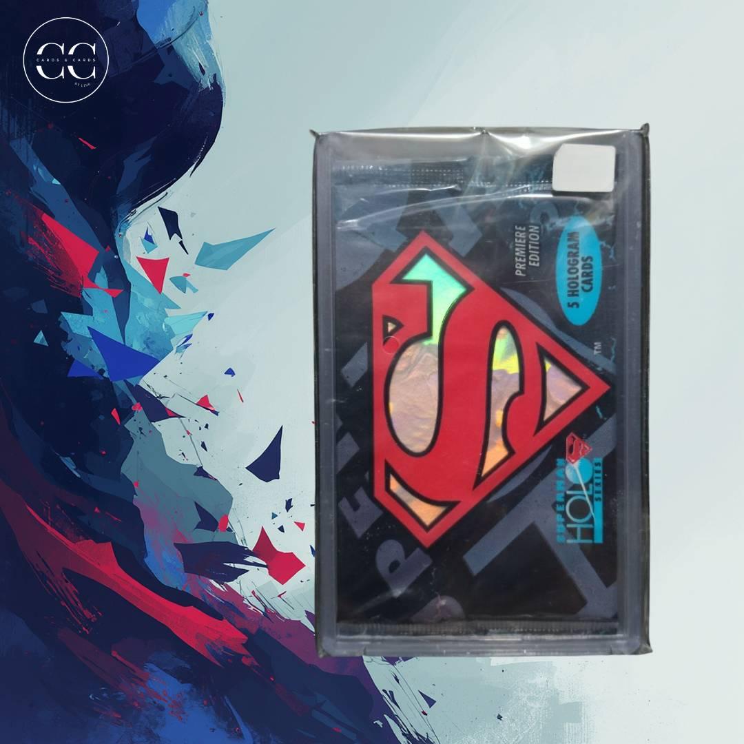 A sealed 1991 Superman Premiere Edition collectible card set featuring 5 holographic cards. This set is part of the DC Comics hologram series and includes iconic Superman designs. The original packaging is intact, showcasing the classic red Superman logo on a black background. Perfect for comic card collectors and fans of Superman memorabilia.