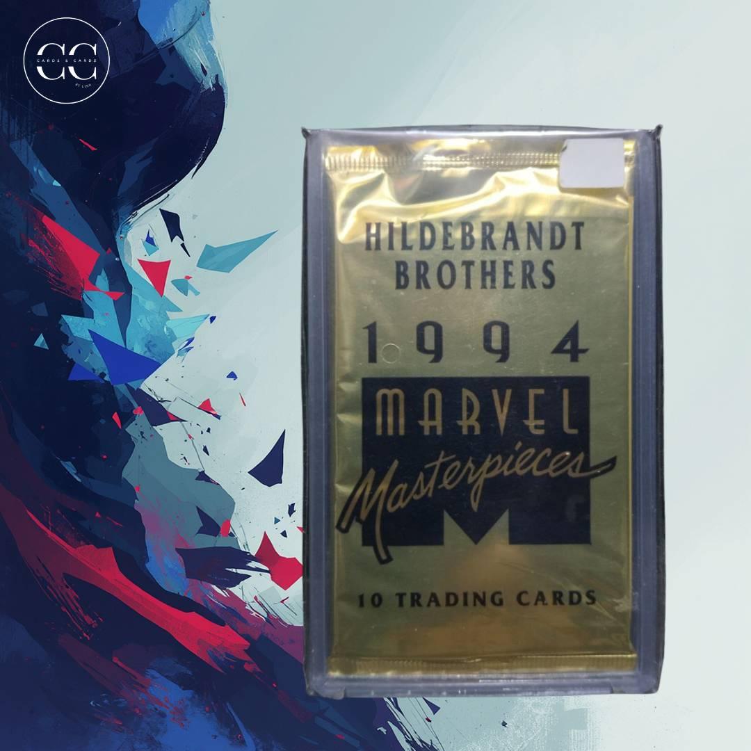 A sealed 1994 Marvel Masterpieces trading card pack featuring artwork by the Hildebrandt Brothers. Contains 10 trading cards showcasing iconic Marvel characters with exquisite illustrations. A valuable collectible for Marvel and comic card enthusiasts.