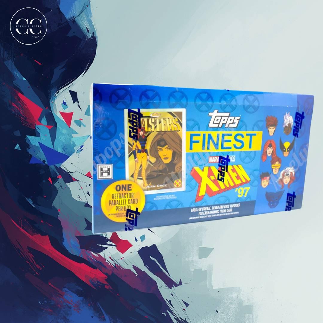 Sealed 1997 Topps Finest Marvel X-Men collectible card game box featuring one refractor parallel card per box. Packaging displays vibrant artwork of X-Men characters like Jean Grey and Wolverine and is factory sealed, ideal for collectors seeking vintage Marvel cards.