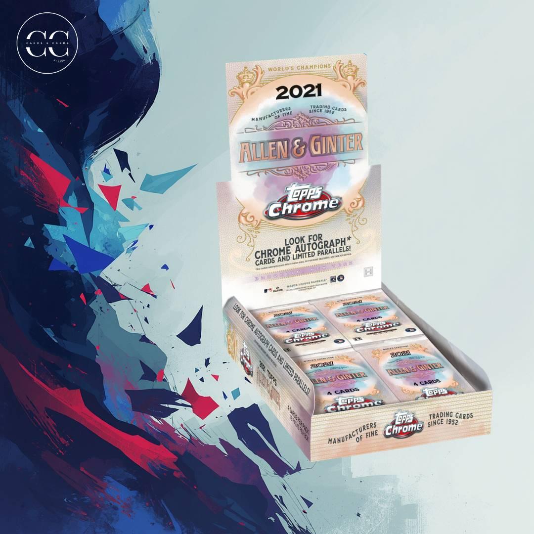 A 2021 Allen & Ginter Topps Chrome trading card box containing multiple packs. This collectible set includes opportunities to find Chrome autograph cards and limited parallel versions, making it ideal for collectors who enjoy sports and themed cards. Each pack contains 4 cards. The box is designed for collectors and enthusiasts seeking rare inserts and autographs from the 2021 series.
