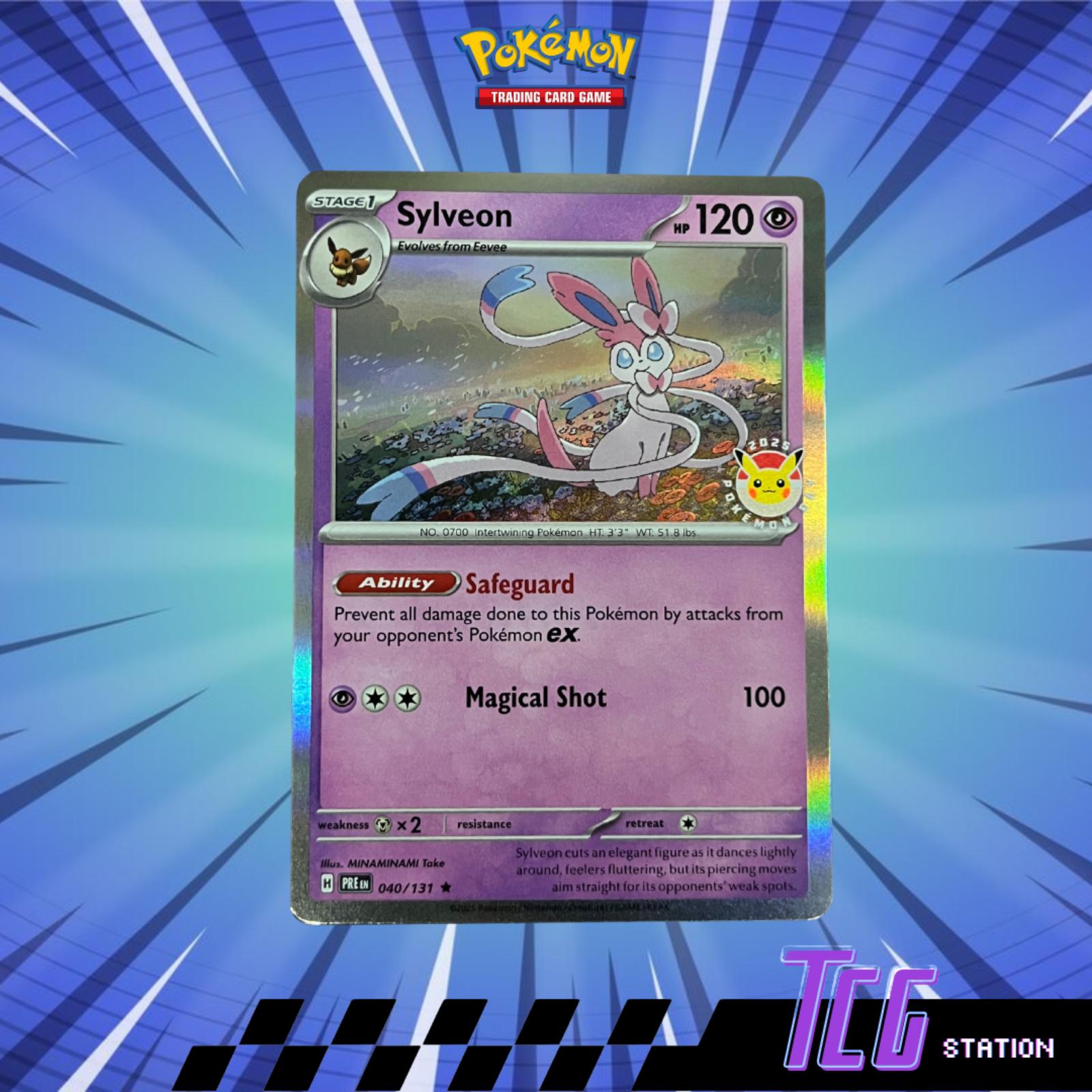 This is a holographic Sylveon card from the 2022 Pokémon Sword & Shield set, numbered 040/131. It features the Ability 'Safeguard' and the attack 'Magical Shot' with 100 damage. Includes the 25th Anniversary Pikachu stamp symbol. Card is well centered with no visible creases or major wear