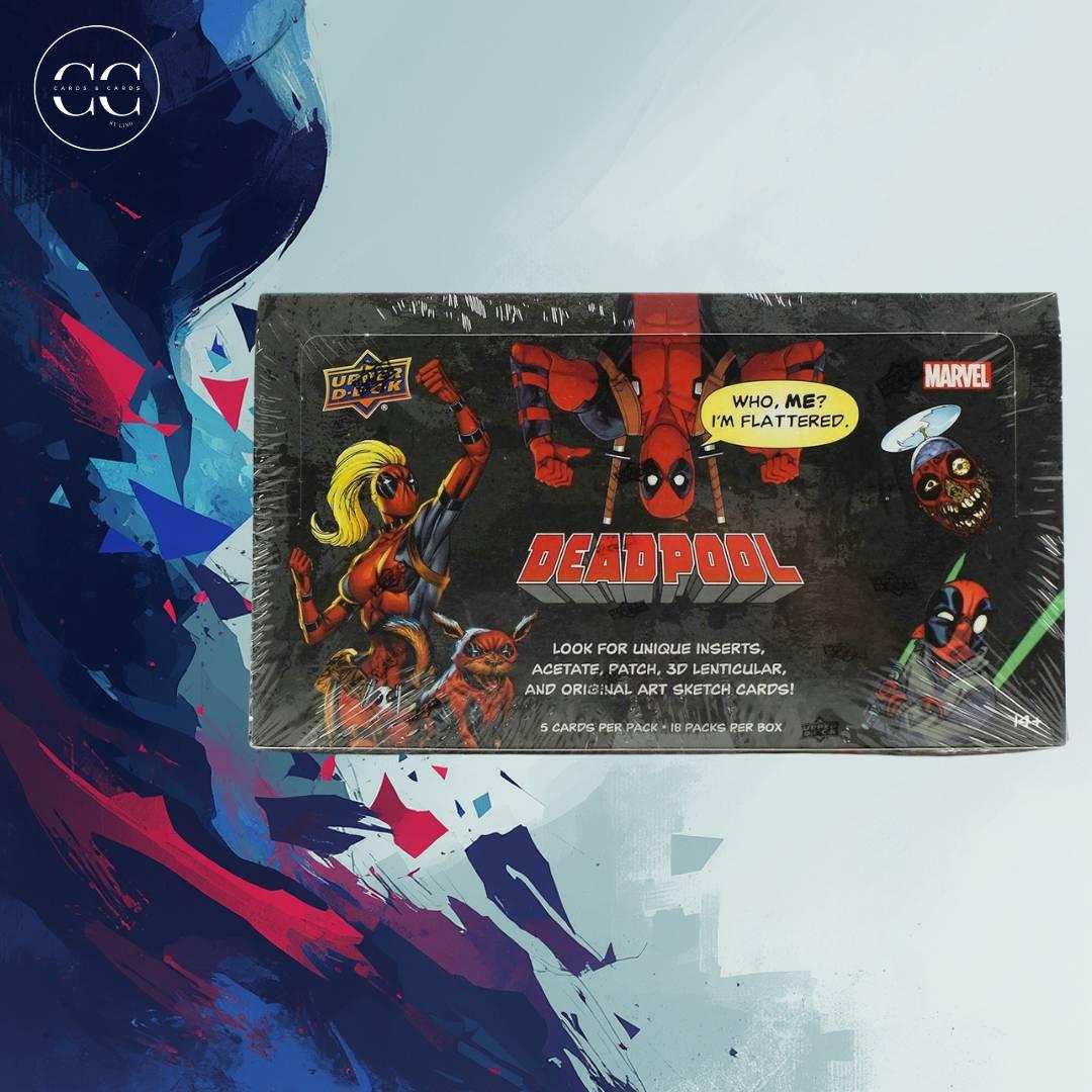 Sealed box of 2022 Upper Deck Marvel Deadpool trading cards featuring unique inserts such as acetate, patch, 3D lenticular, and original art sketch cards. Each pack contains 5 cards and the box includes 18 packs. A must-have collectible for Marvel and Deadpool fans.
