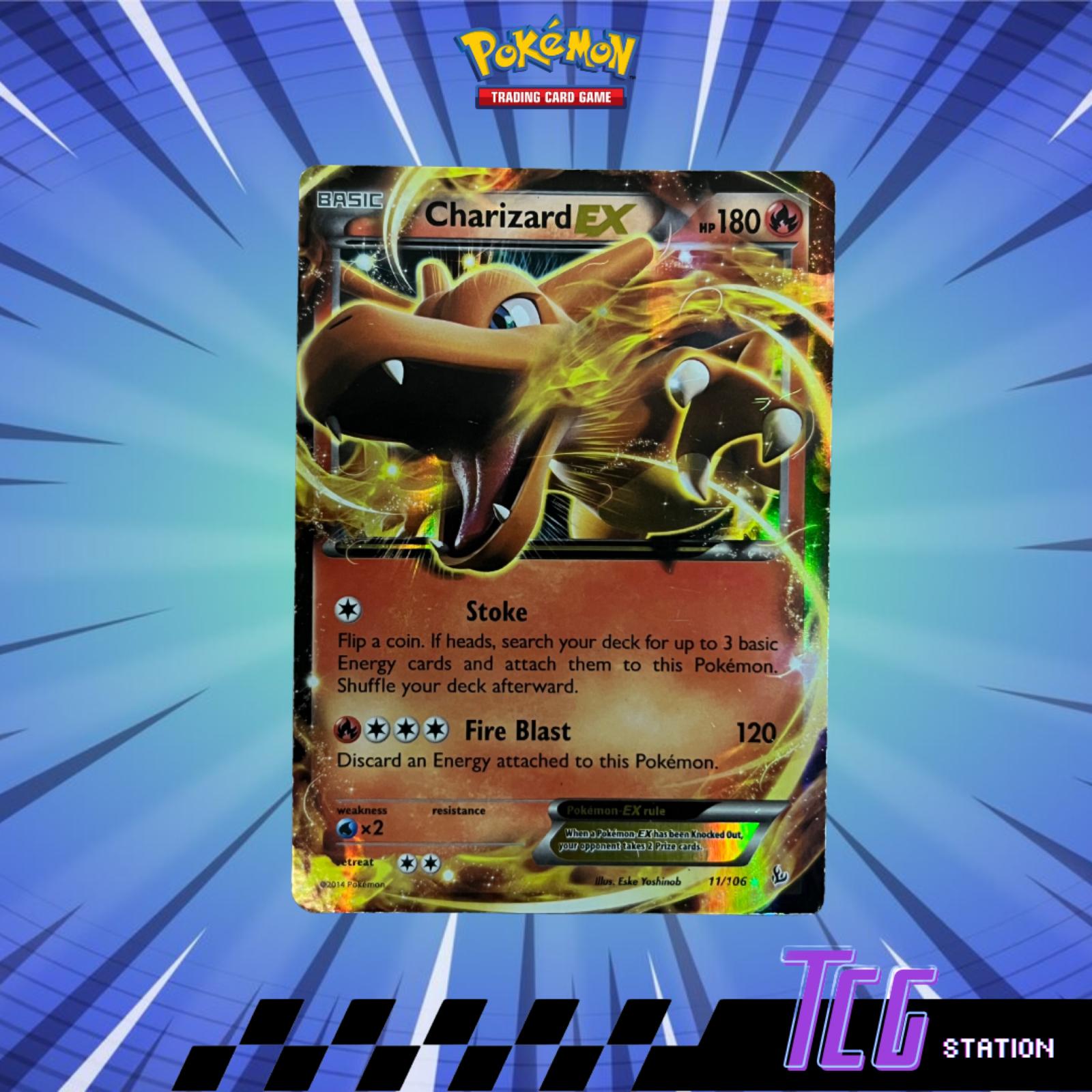 This is a Charizard EX holographic trading card from the Pokémon Trading Card Game, numbered 11/106. Features the Fire Blast attack with 120 damage and Stoke ability. A collectible card in great condition, showcasing vibrant artwork and holographic effects.