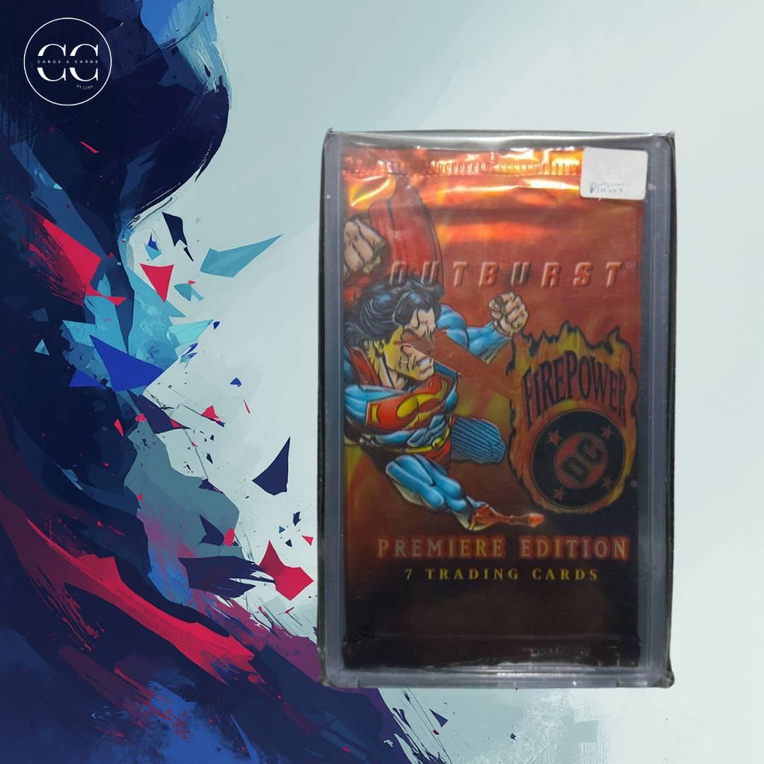 A sealed pack of DC Outburst Firepower Premiere Edition collectible trading cards featuring 7 cards. The pack showcases Superman artwork and is a rare find for DC card collectors. The packaging is intact with slight edge wear, stored inside a protective case.