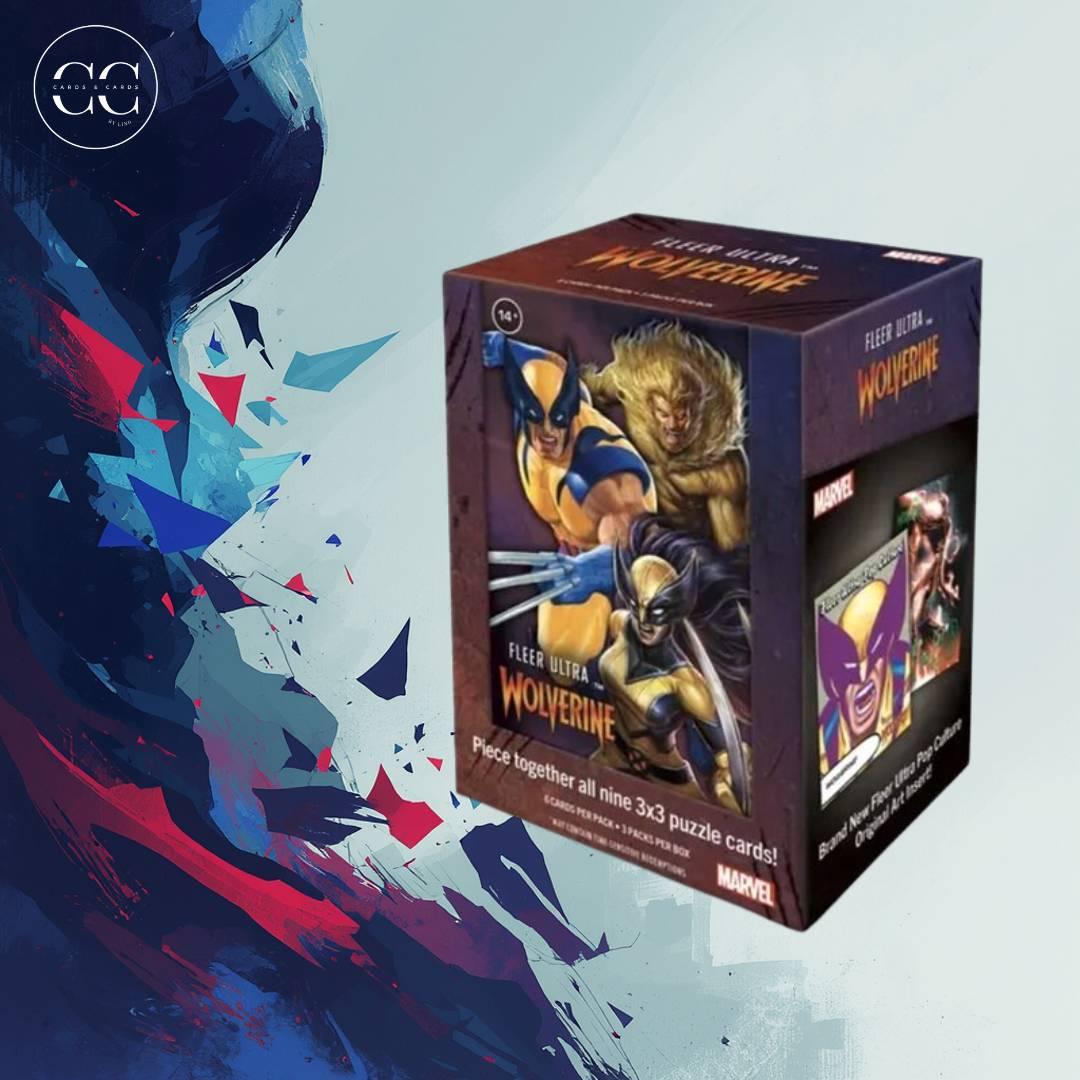 This collectible card game box features Fleer Ultra Wolverine cards. The set includes nine 3x3 puzzle cards to piece together an artwork. The box artwork showcases Wolverine and related characters, making it a great addition for Marvel and CCG collectors.