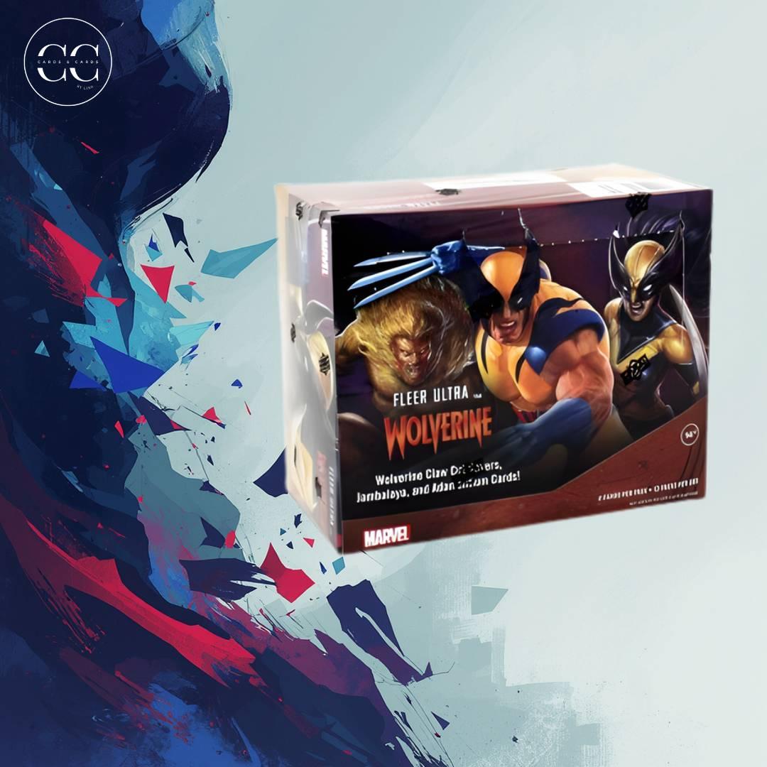 Sealed Fleer Ultra Wolverine booster box featuring Wolverine Clan Décor items, Jambalaya, and Iron Action Cards from the Marvel universe. This collectible card box is perfect for fans and collectors looking to expand their Marvel card collection.