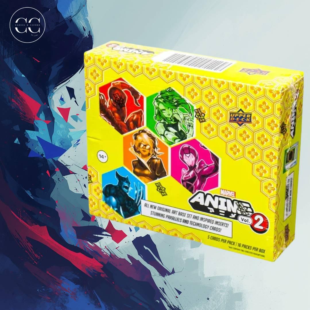 A sealed box of Marvel Animated Series Vol. 2 collectible trading cards by Upper Deck. Features original art base set, inspired inserts, stunning parallels, and technology cards. Contains 16 packs with 5 cards each.