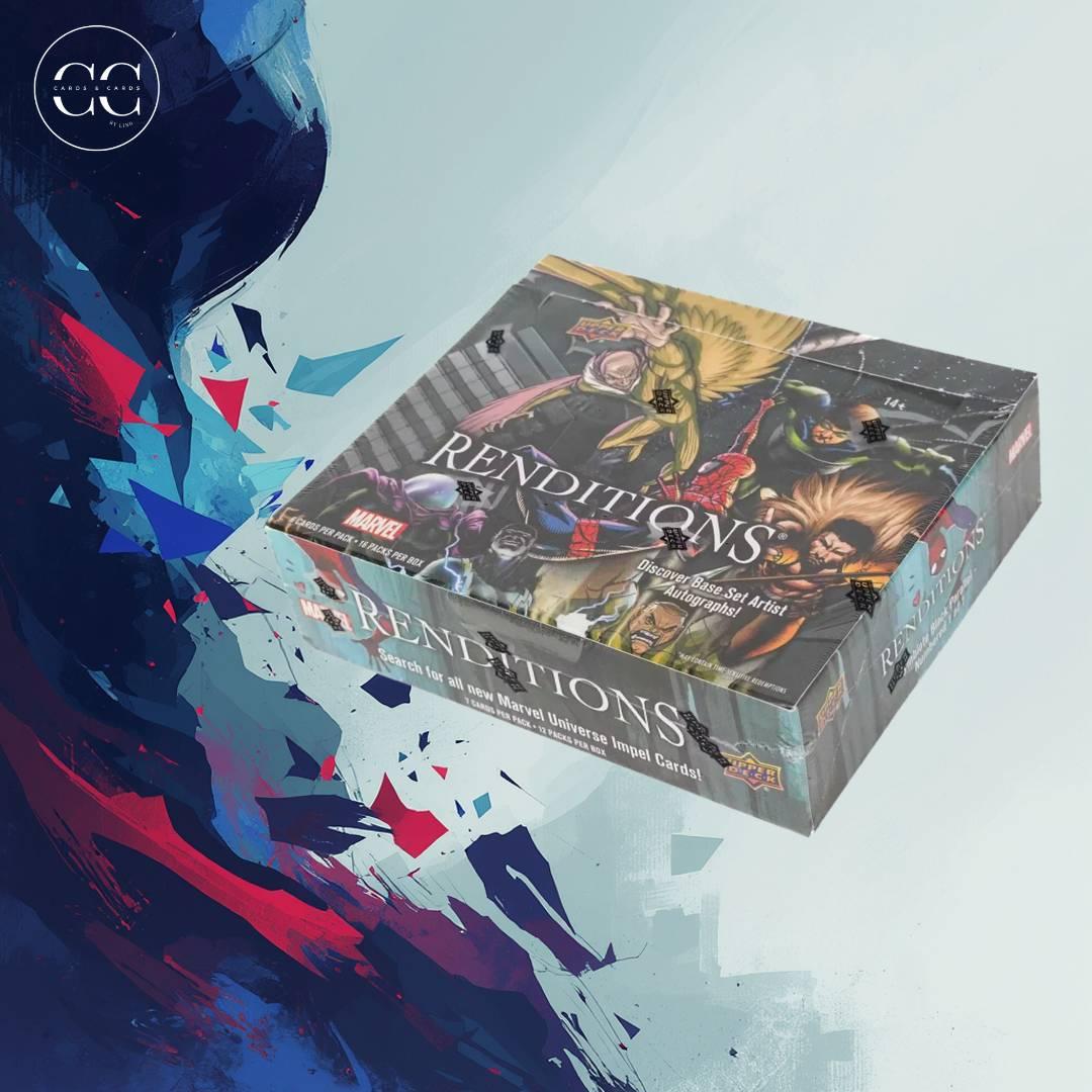 Sealed Marvel Renditions 2023 Base Set booster box featuring artwork and impel cards. The box is unopened and factory sealed, ensuring authentic collectible condition and potential for artist autograph cards.