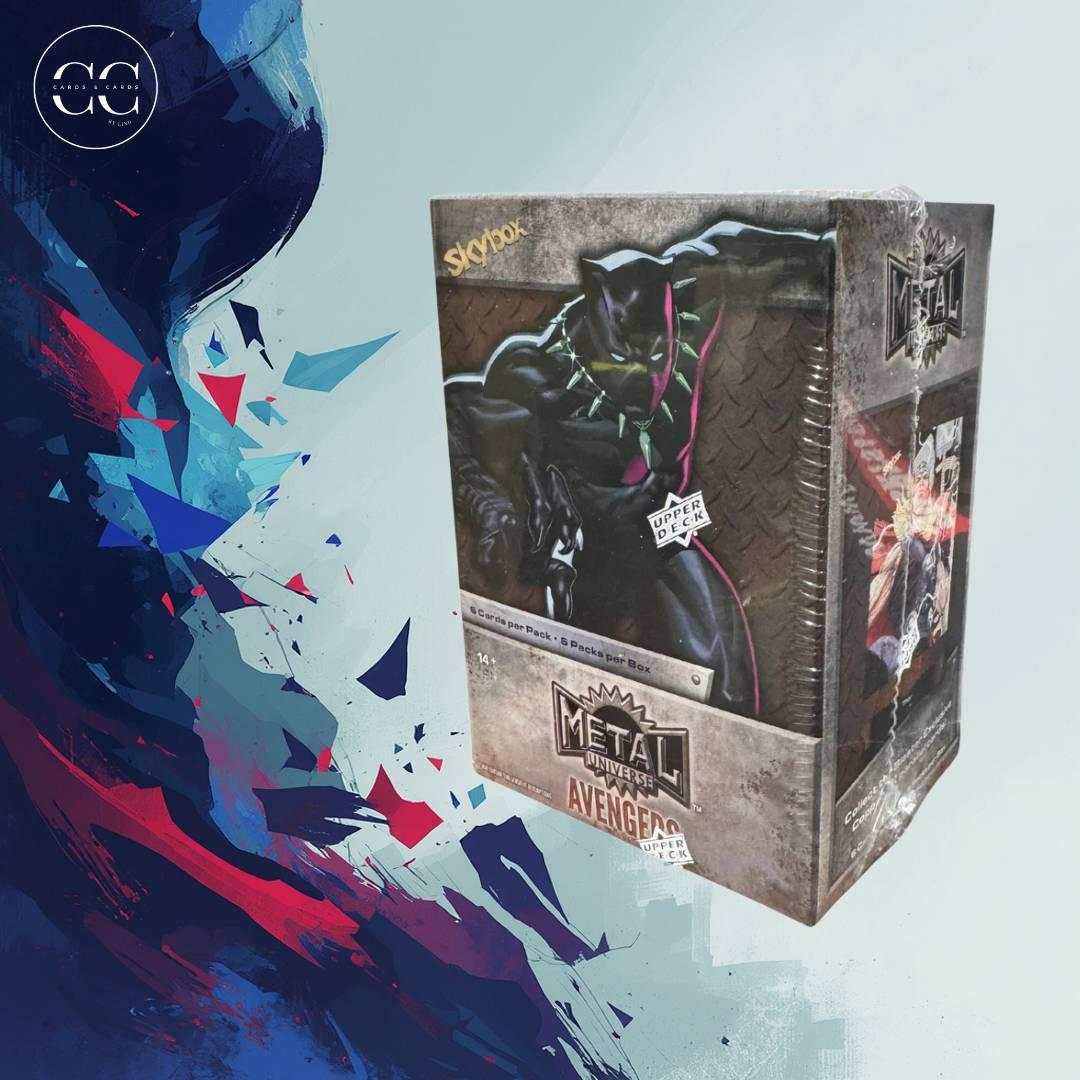 Sealed Metal Universe Avengers collectible card game box by Skybox/Upper Deck featuring Marvel characters. Contains 6 packs per box with 5 cards per pack. Ideal for collectors and Marvel fans.