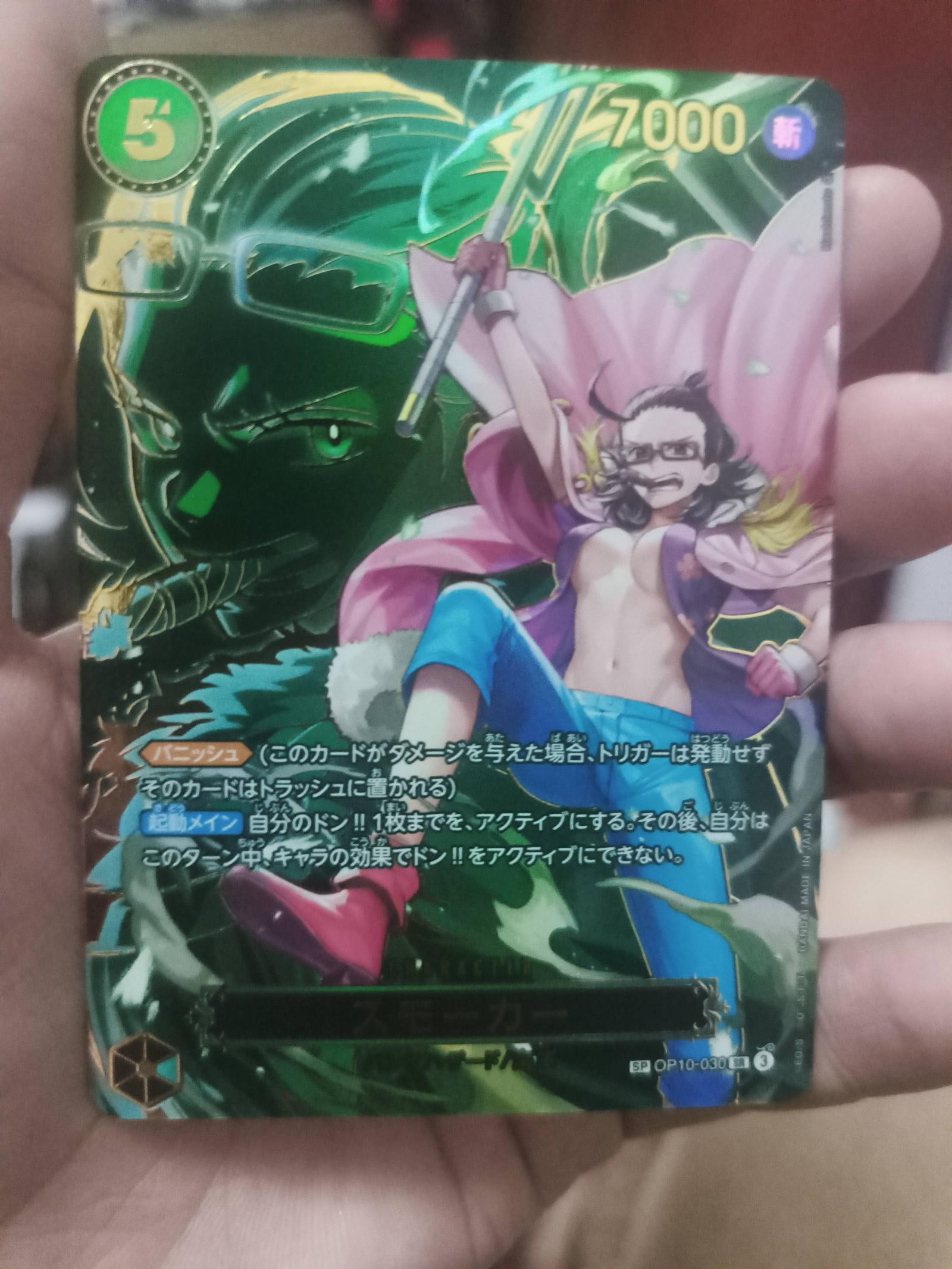 Rare One Piece Card Game character card featuring Smoker. The card has vibrant artwork with Japanese text and a 7000 power rating. The card shows some slight wear and edge whitening visible in the images, but overall the card art remains clear and colorful. The card is part of the special SP OP10 series.
