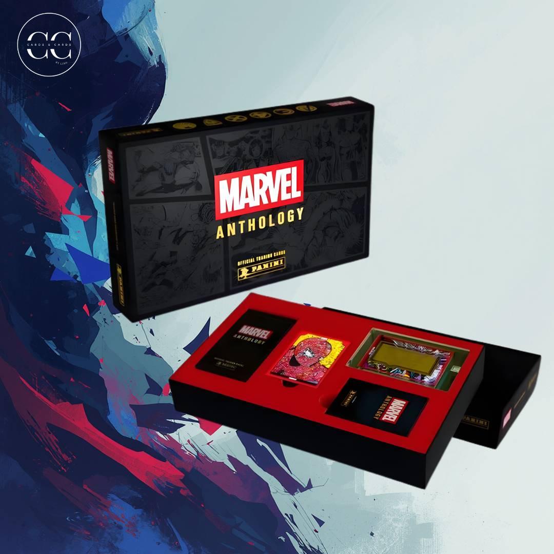 A complete Panini Marvel Anthology official trading card set featuring exclusive limited edition cards and collector's accessories in a premium display box. Perfect for Marvel and collectible card game enthusiasts.