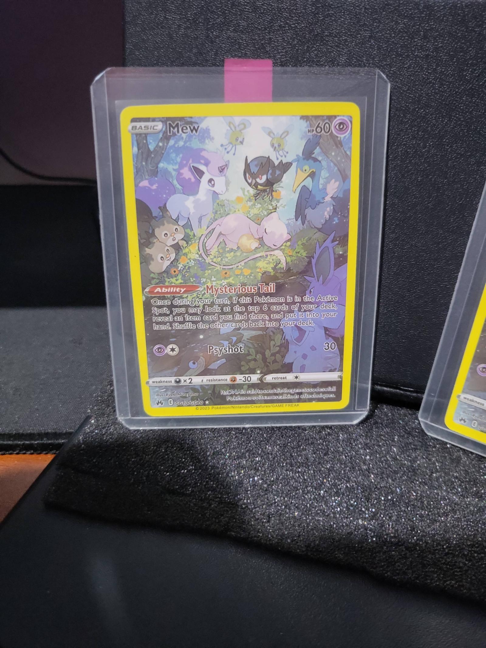 This is a Pokémon collectible card featuring Mew with 60 HP, showcasing the Mysterious Tail ability and Psyshot attack. The card is kept in a protective plastic sleeve, maintaining its vibrant colors and clear text. Released in 2023, it is a great addition for any Pokémon card collector or player.