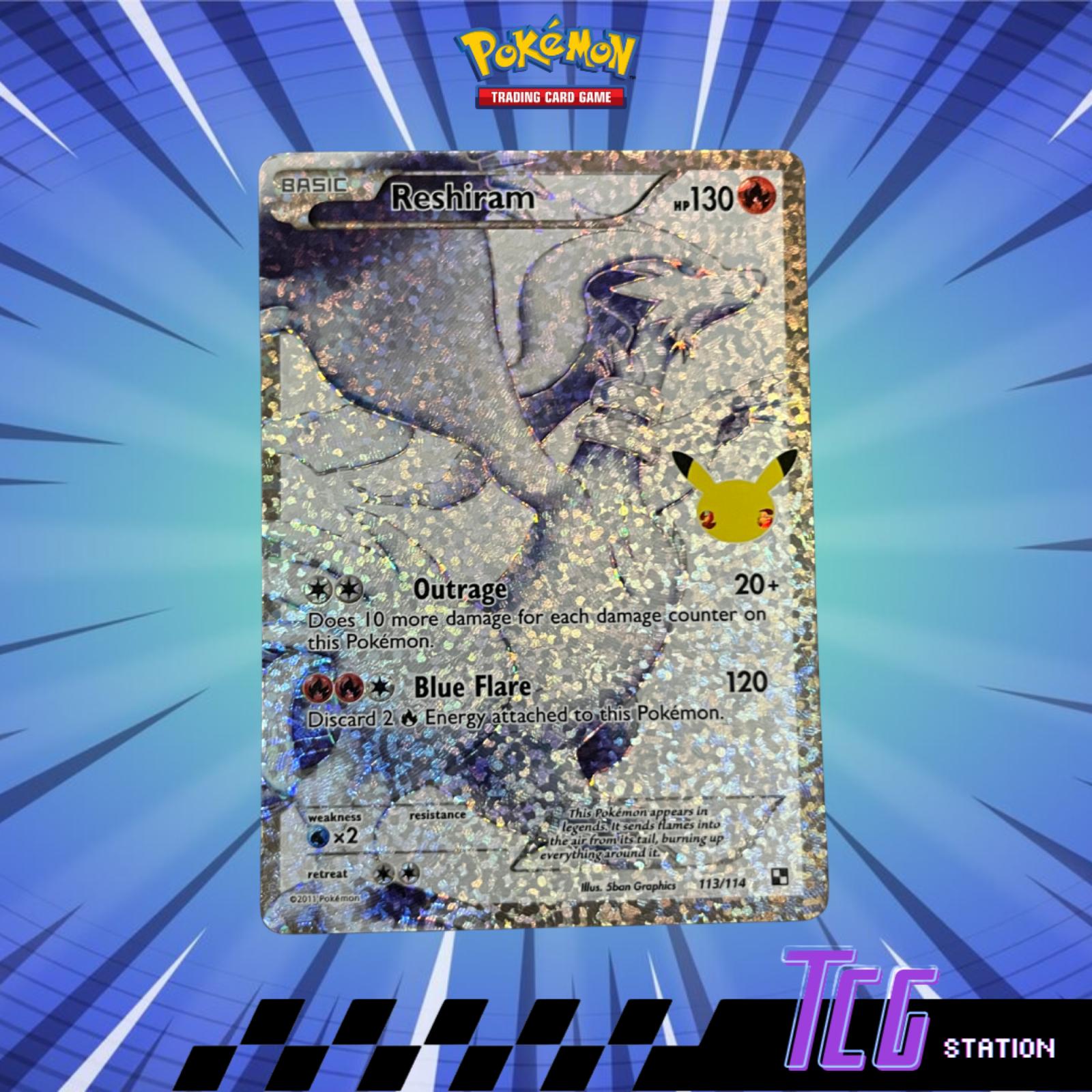A holographic Reshiram Pokémon card from the 2011 set, numbered 113/114, featuring a special Pikachu 25th Anniversary stamp. This Basic Fire-type card has 130 HP and includes the moves Outrage and Blue Flare. The card is visually striking with a silver foil sparkle finish. Ideal for Pokémon TCG collectors and fans of iconic legendary Pokémon