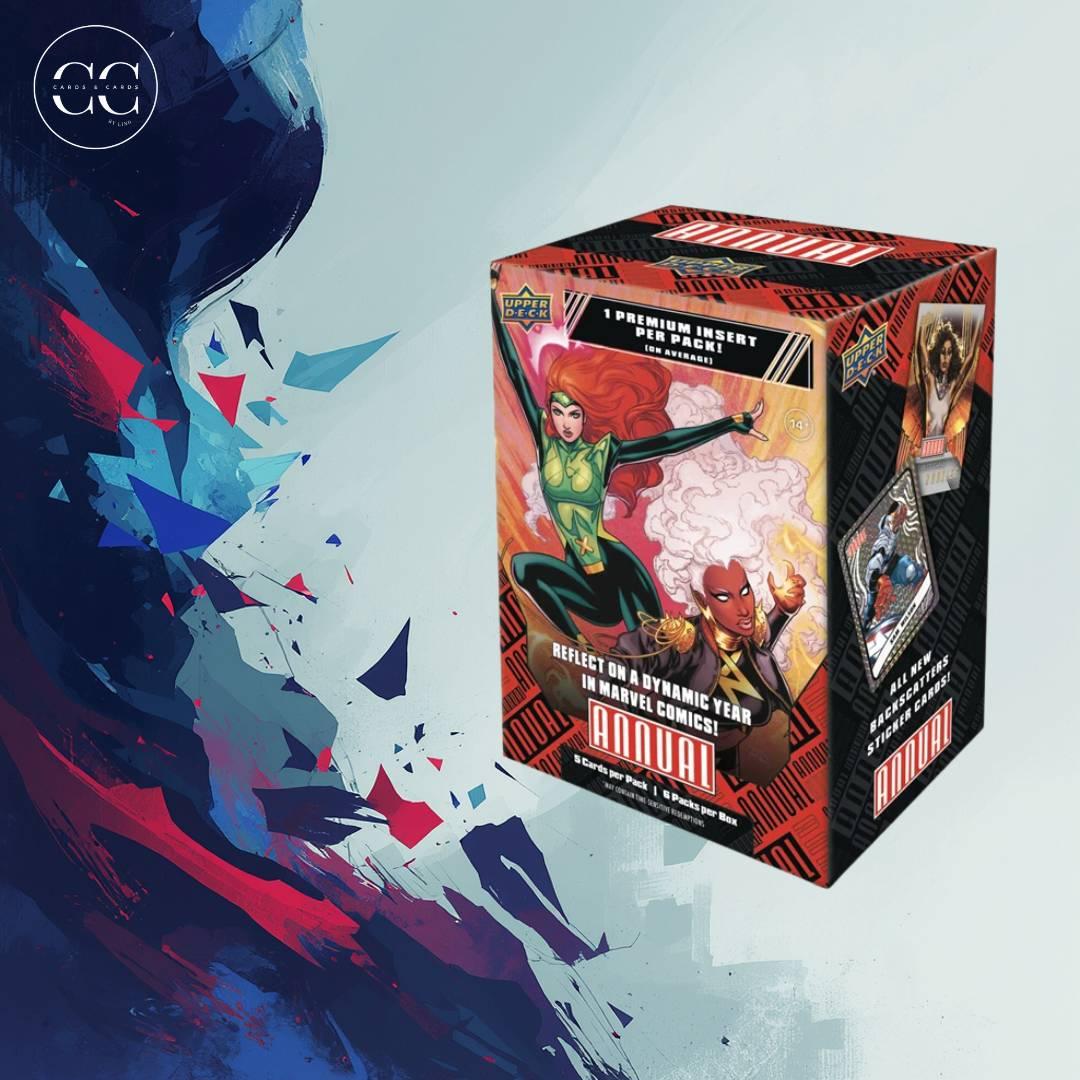 This sealed box contains multiple packs of the Upper Deck Marvel Annual 2022 collectible card game, featuring dynamic artwork of Marvel characters like Jean Grey and Storm. Each pack includes 5 cards with 1 premium insert on average, plus exclusive backsheets and stickers. A must-have for Marvel and CCG collectors.