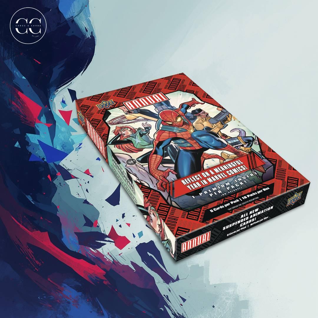 Sealed box of Upper Deck Marvel Annual 2023 collectible card game featuring Spider-Man and other Marvel characters. Contains 16 packs, each with 5 cards, including all-new suspended animation cards. Perfect for Marvel and CCG collectors.