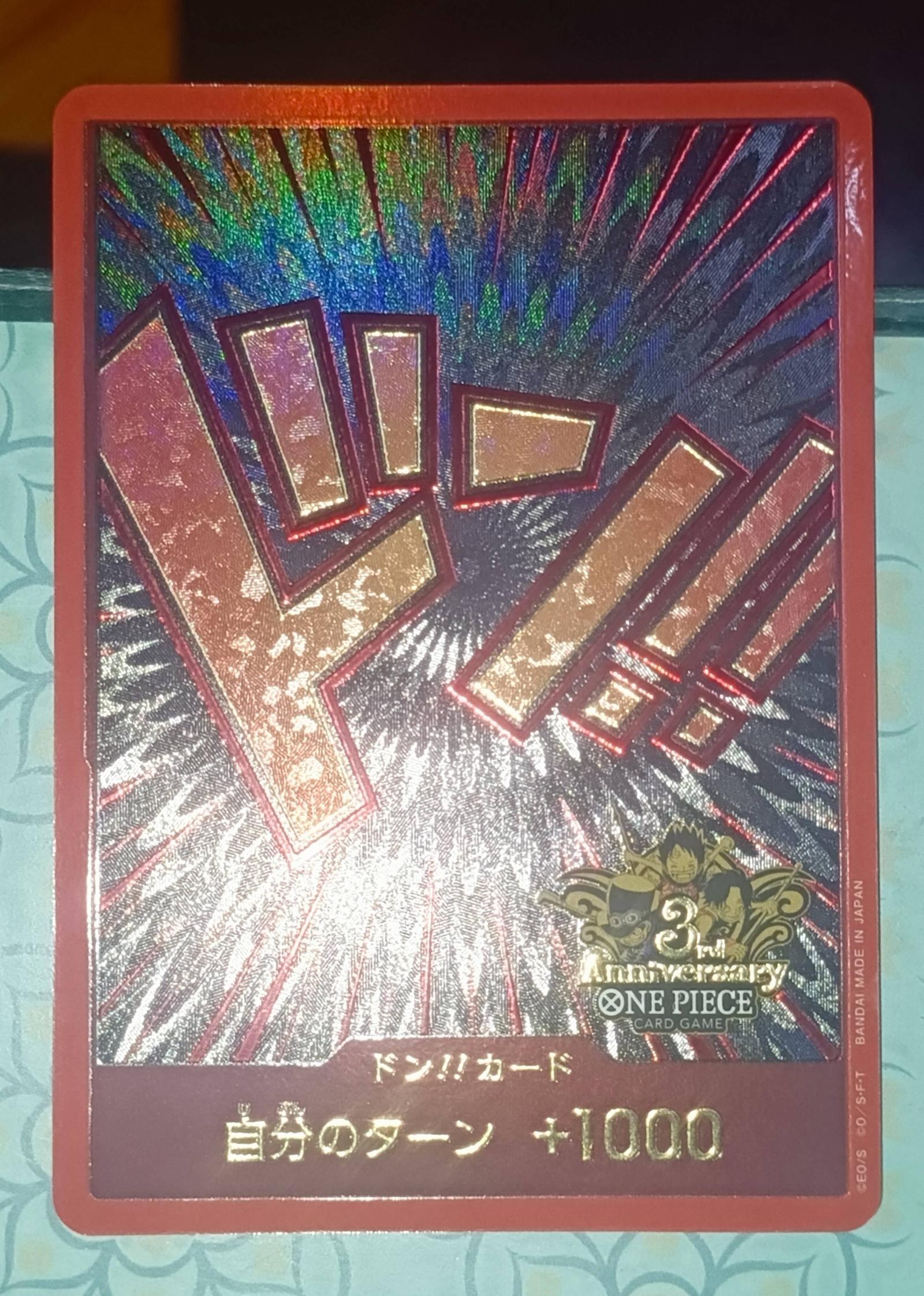 A rare collector's edition Don!! card from the One Piece Card Game 3rd Anniversary series. The card features vibrant holographic foil with Japanese text and a +1000 bonus effect for your turn. This limited edition card is a valuable addition for collectors and fans of the One Piece Card Game.