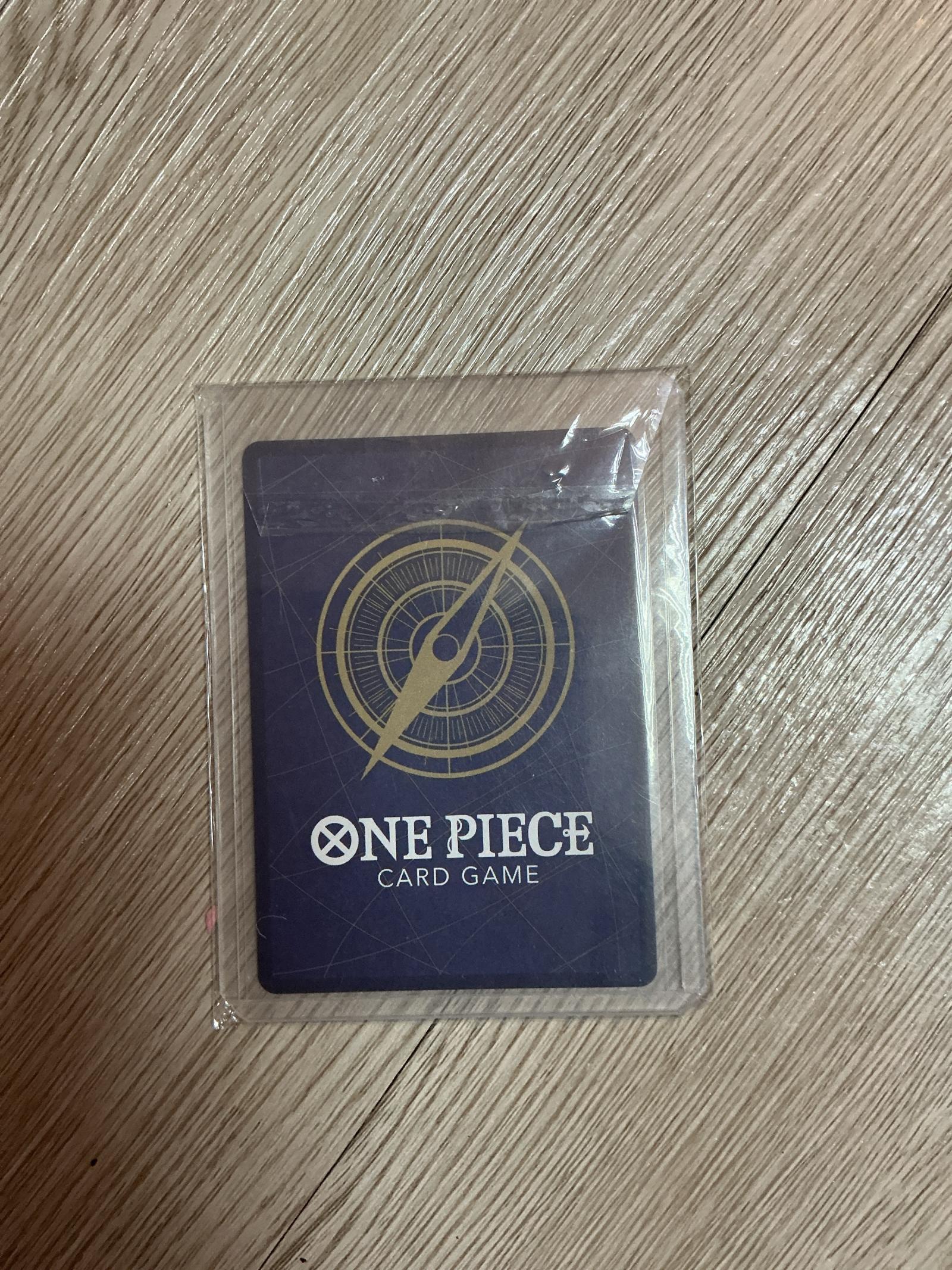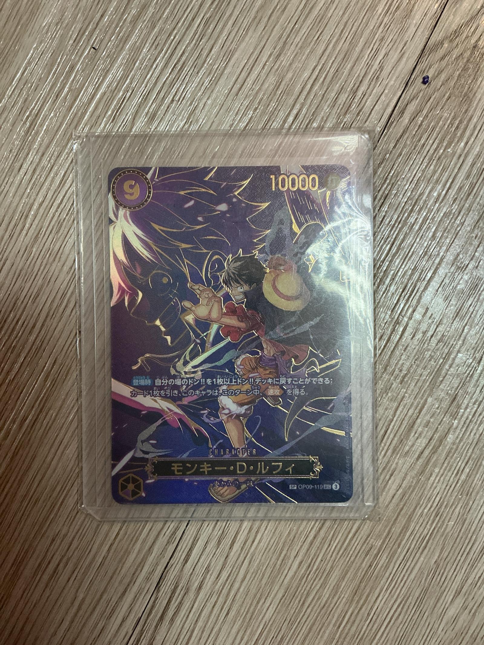 A Japanese edition character card featuring Monkey D. Luffy from the One Piece Card Game. The card is encased in a protective sleeve and appears to have slight edge wear on the back side. Suitable for collectors of One Piece memorabilia and card game enthusiasts.