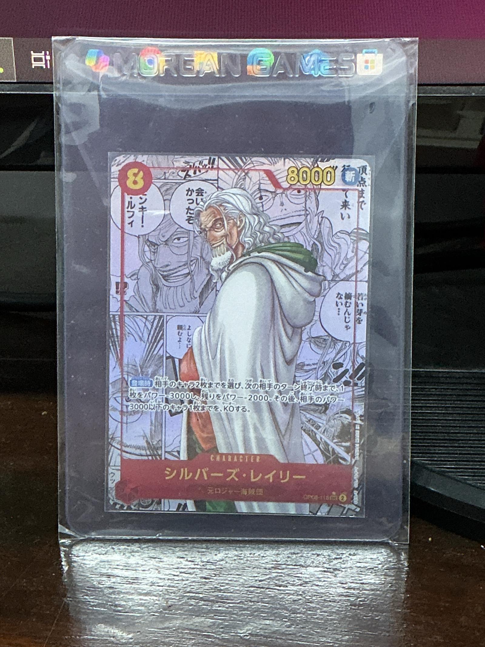 A collectible character card featuring Silvers Rayleigh from One Piece, in original protective sleeve with Japanese text. Part of a collector’s set, this card showcases detailed artwork and stats, ideal for fans and collectors of One Piece memorabilia.