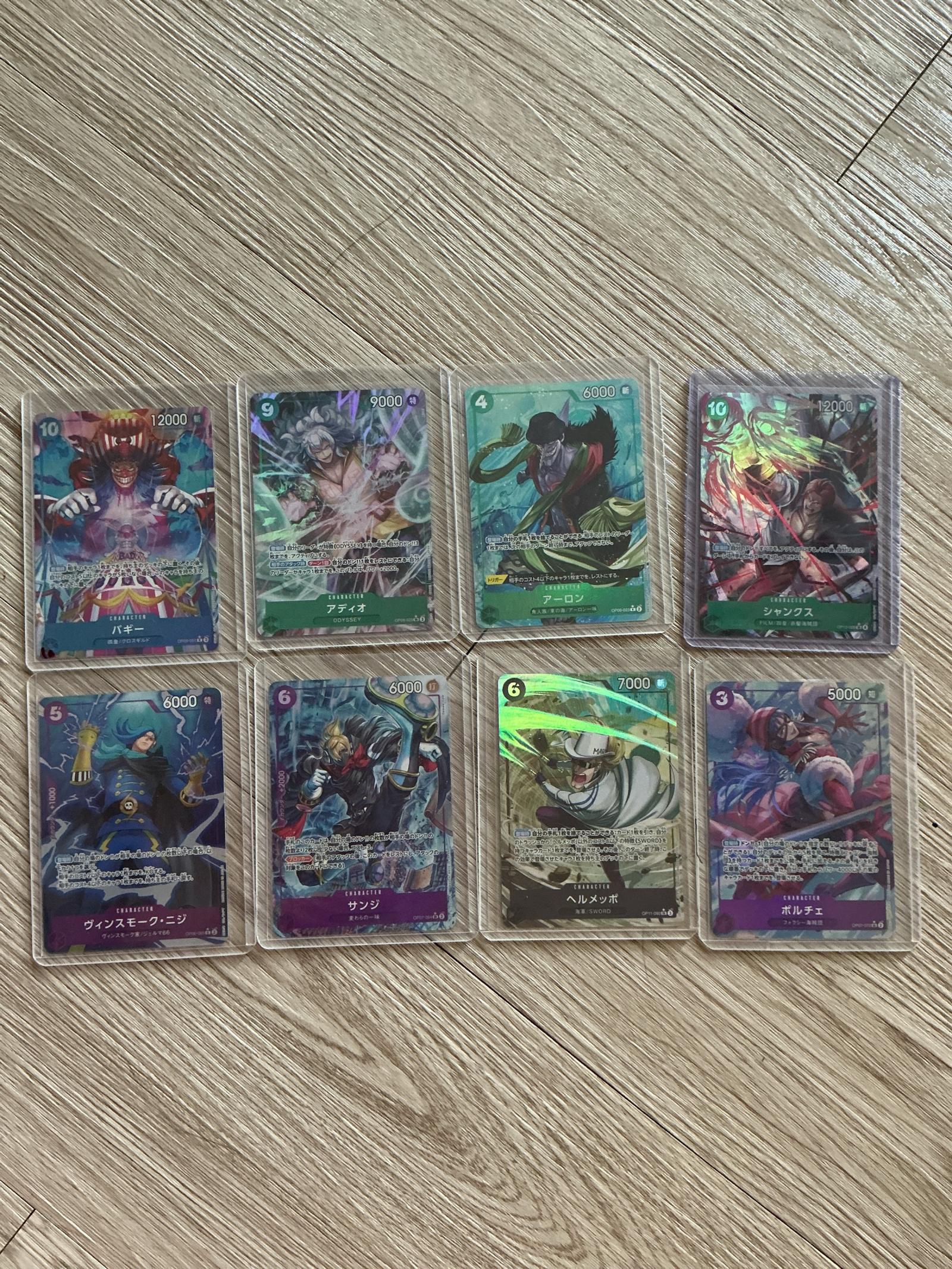 A set of 8 collectible Japanese character cards featuring popular One Piece characters including Luffy, Zoro, Ace, Shanks, and others. The cards are holographic with detailed artwork and text in Japanese. Each card is individually sleeved for protection. Ideal for collectors and fans of the One Piece series.