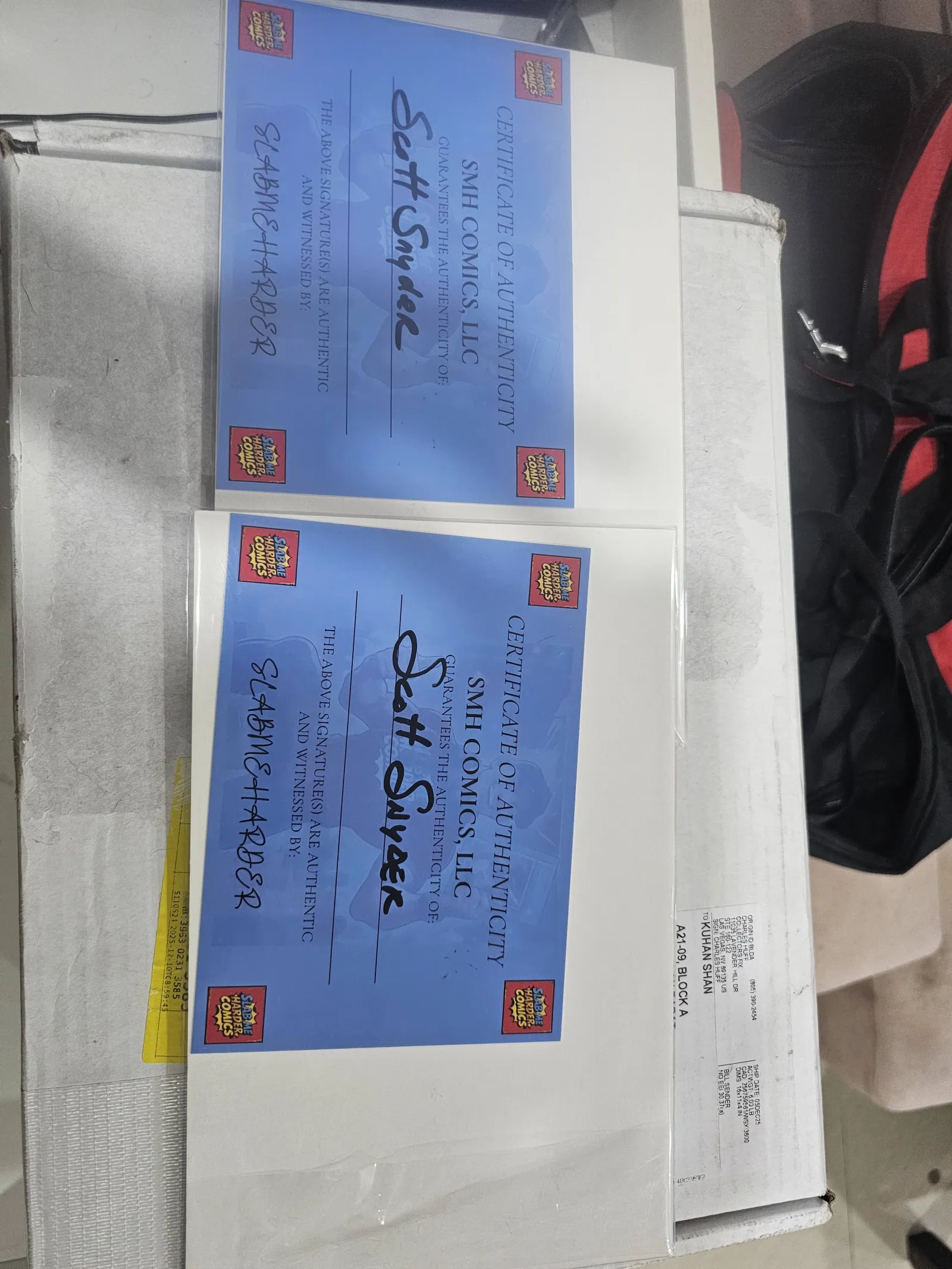 Each front cover is signed by writer Scott Snyder in silver marker; signatures are bold and on‑cover as shown. Two SMH Comics Certificates of Authenticity are included (one COA per signed book). When placed side‑by‑side the foil artwork connects to form a single display piece, making this pair especially attractive for framing or shelf display.