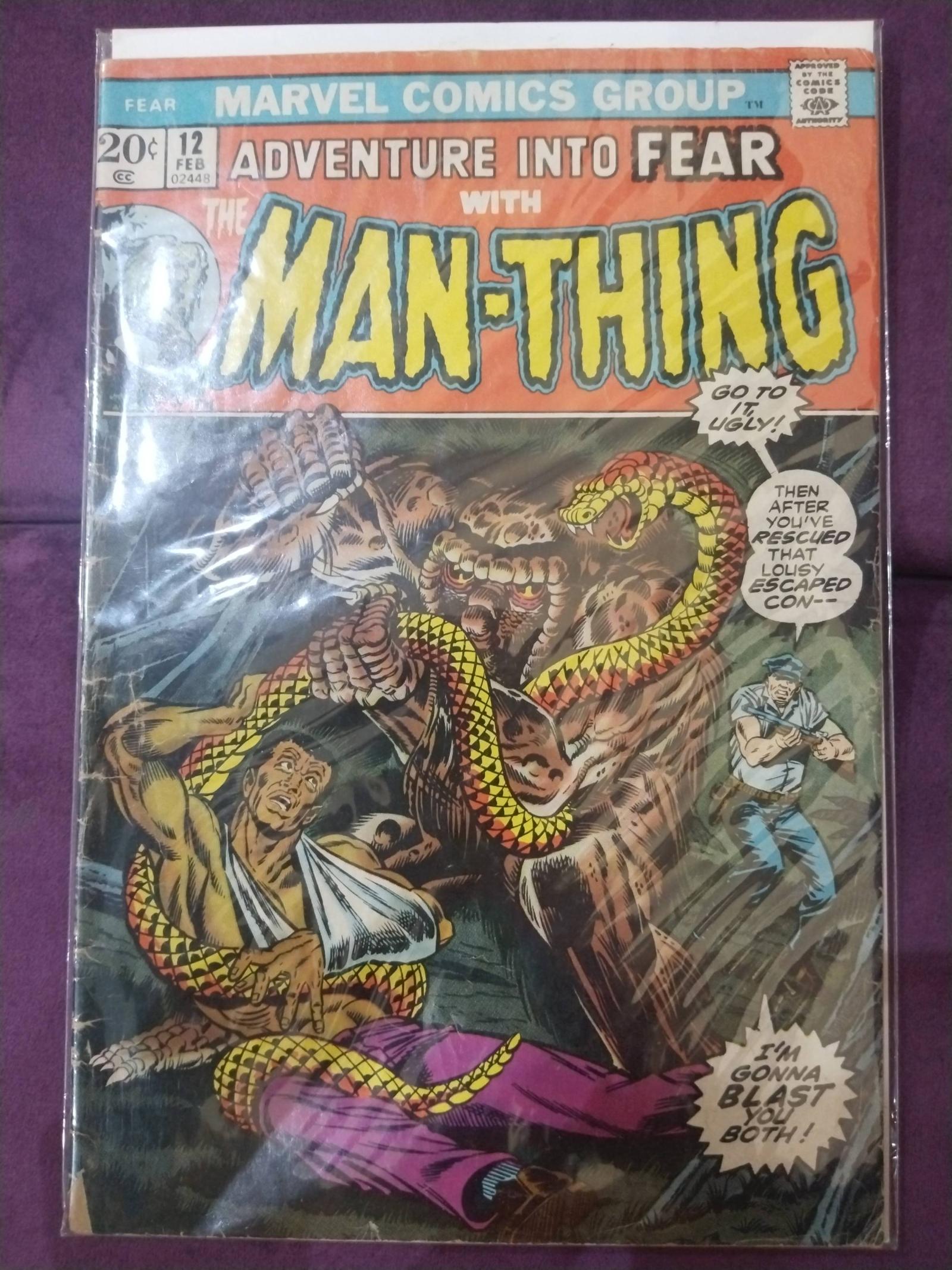 Adventure Into Fear #12 featuring Man-Thing, published by Marvel Comics in February 1972. Created by writer Steve Gerber and artist Val Mayerik. This issue is notable for continuing the eerie and suspenseful tales of Man-Thing in the horror genre.