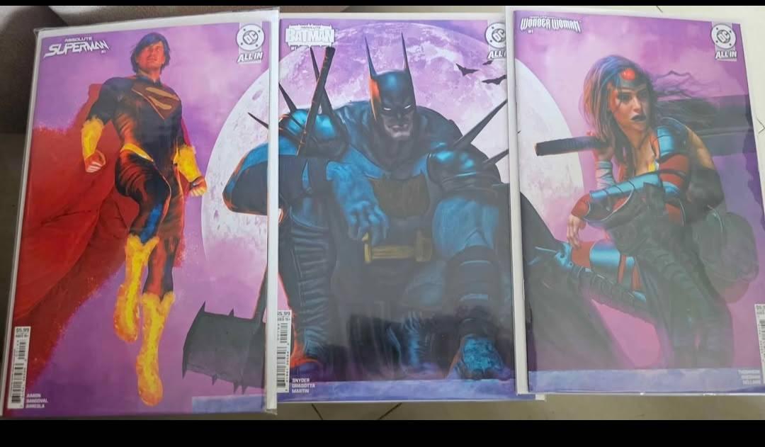 Set of three All-In #1 (Absolute) variant covers sold together as a matched trio: Superman, Batman and Wonder Woman. Each issue is raw (ungraded) and has been stored in protective bags with backing boards. I conservatively grade these as Near Mint based on visible surfaces, corners, and the supplied photos — no obvious creases, tears, or spine splits are visible.