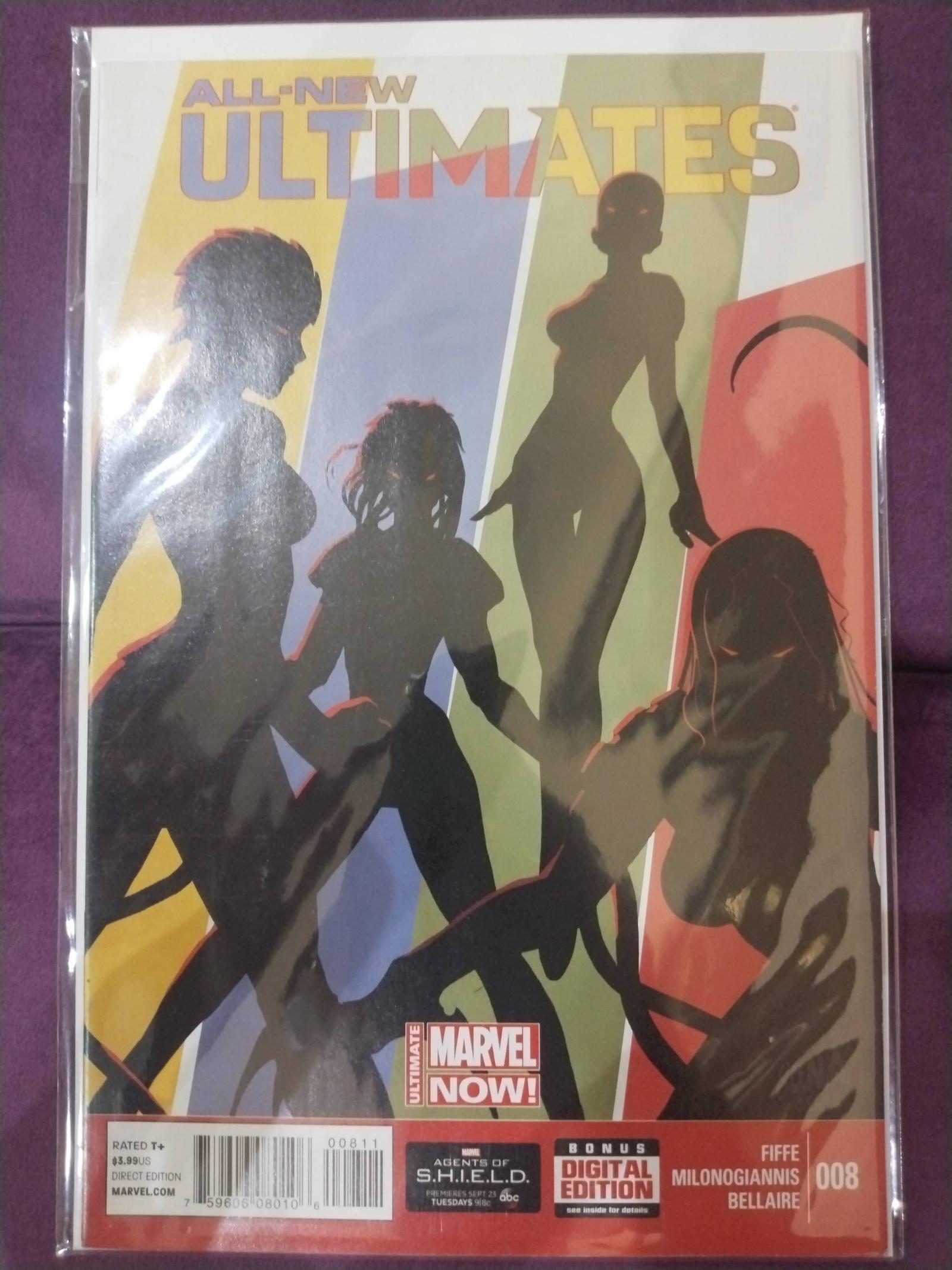 All-New Ultimates issue #8 from the Marvel Now! series, published in 2014. Featuring art by David Lafuente, with writing by Michel Fiffe and colors by Valentina Bellaire. This edition includes a bonus digital copy. The cover showcases striking silhouette artwork highlighting the team. Not graded or slabbed.