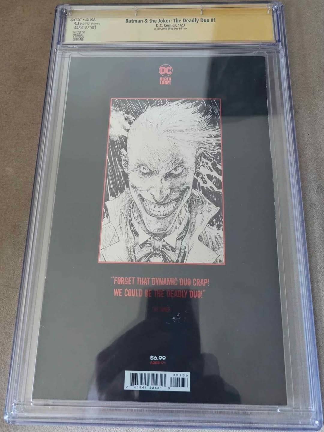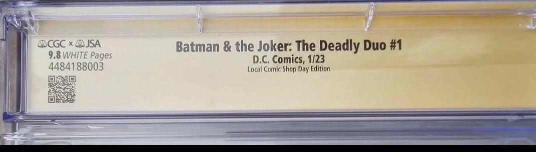 The comic book in the image is a Batman & The Joker: The Deadly Duo #1 Local Comic Shop Day (LCSD) special edition with a black and white foil cover variant by Marc Silvestri. The copy is graded by CGC at 9.8 (Near Mint/Mint) and features an authentic signature by Silvestri, verified by JSA. Key Details & Value Issue: Batman & The Joker: The Deadly Duo #1 Publisher: DC Comics (under their DC Black Label imprint) Publication Date: November 23, 2022 (for the LCSD edition) Cover Artist & Writer: Marc Silvestri Variant: This is a black and white, foil-stamped "Local Comic Shop Day" edition, making it a rare and collectible variant. Grade: The comic is professionally graded by Certified Guaranty Company (CGC) as 9.8, indicating near-perfect condition. Authenticity: The "CGC JSA Authentic Autograph" label confirms that the signature from Marc Silvestri was witnessed and verified as authentic.