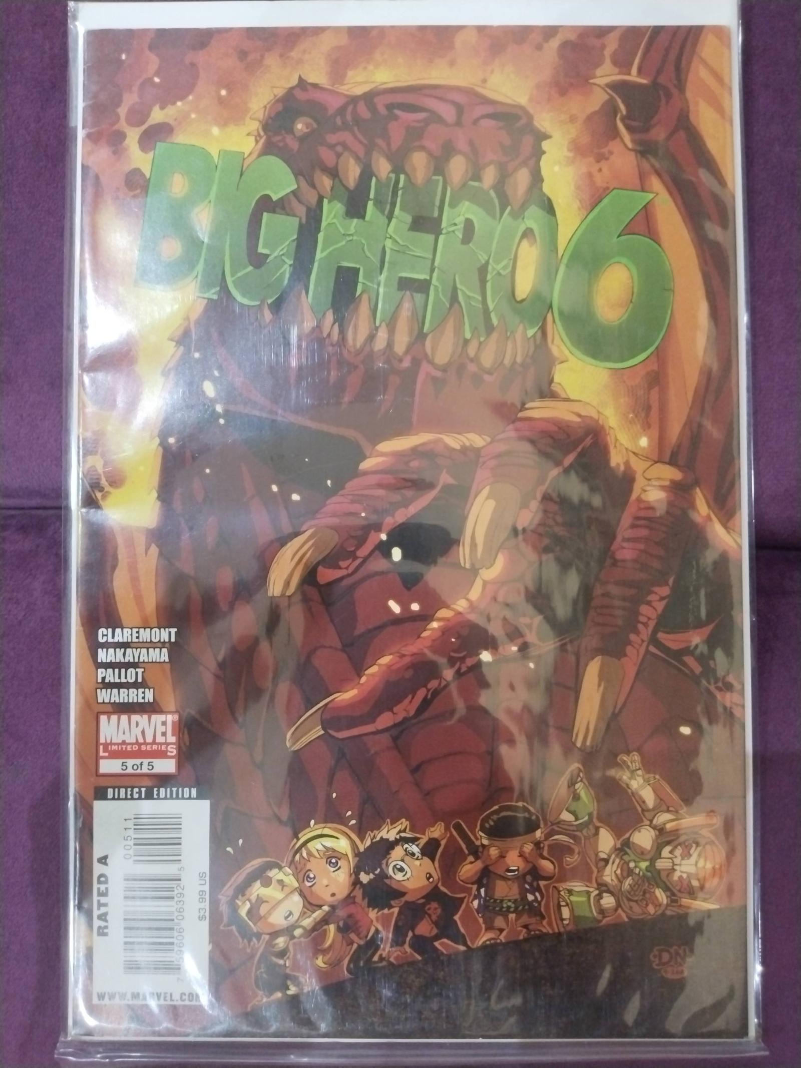 Big Hero 6 issue #5, part of a 5-issue limited series by Marvel. Writers: Claremont and Nakayama. Art by Pallot and Warren. Features a dramatic cover with a monstrous figure looming over the Big Hero 6 characters. Direct edition, rated A. No grading information available.
