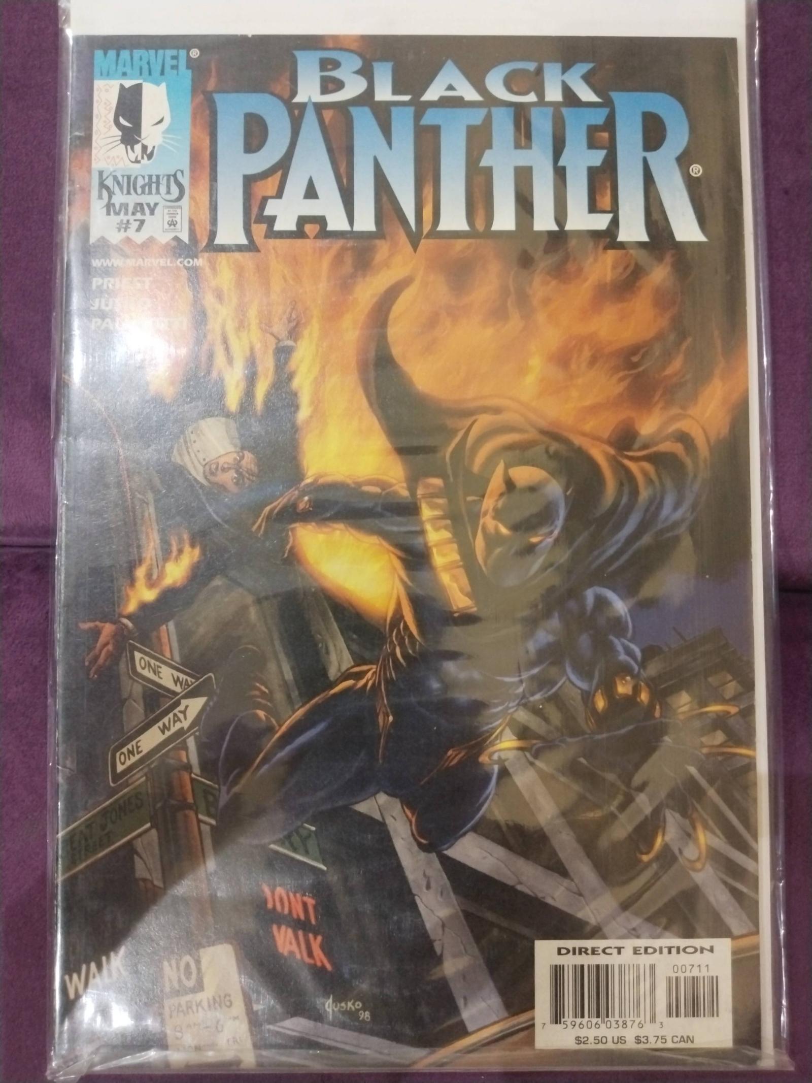 Black Panther issue #7 from the Marvel Knights series, published in May 1998. Cover art by Dusko. This is a direct edition comic featuring the iconic Black Panther character in action against a fiery city backdrop. No grading or slab status provided.