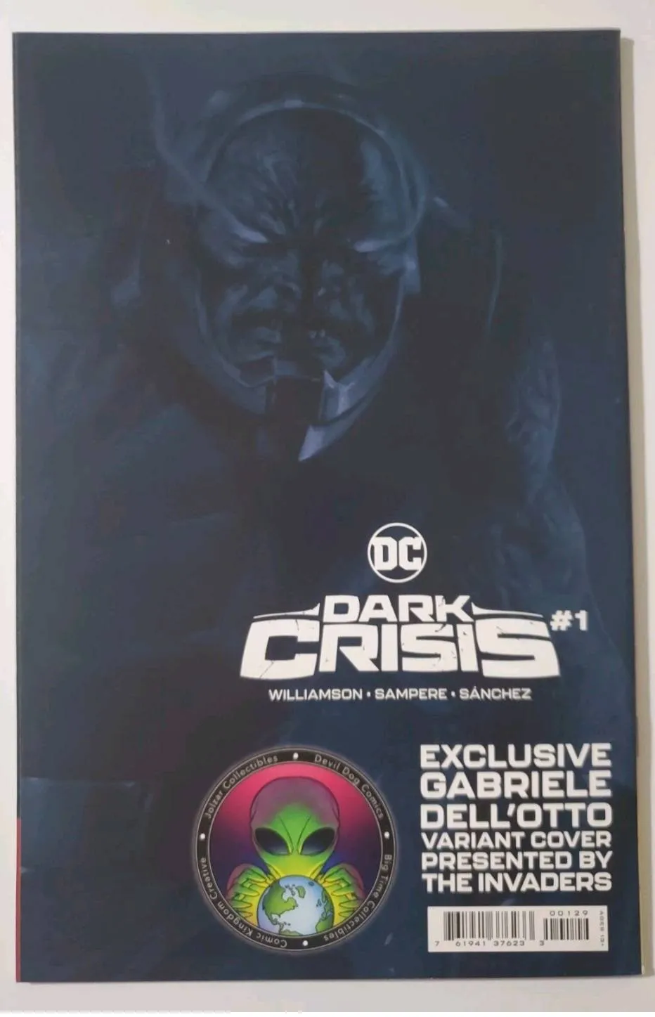 I am selling a Dark Crisis #1 (2022) Gabriele Dell’Otto minimal variant in NM+ condition. This is an ungraded, retailer-exclusive variant presented by The Invaders (logo appears on the back cover). The book has been stored bagged and boarded and shows no major defects visible in photos — sharp corners, flat spine, clean cover surface, and no noticeable creases or spine roll consistent with the NM+ grade.