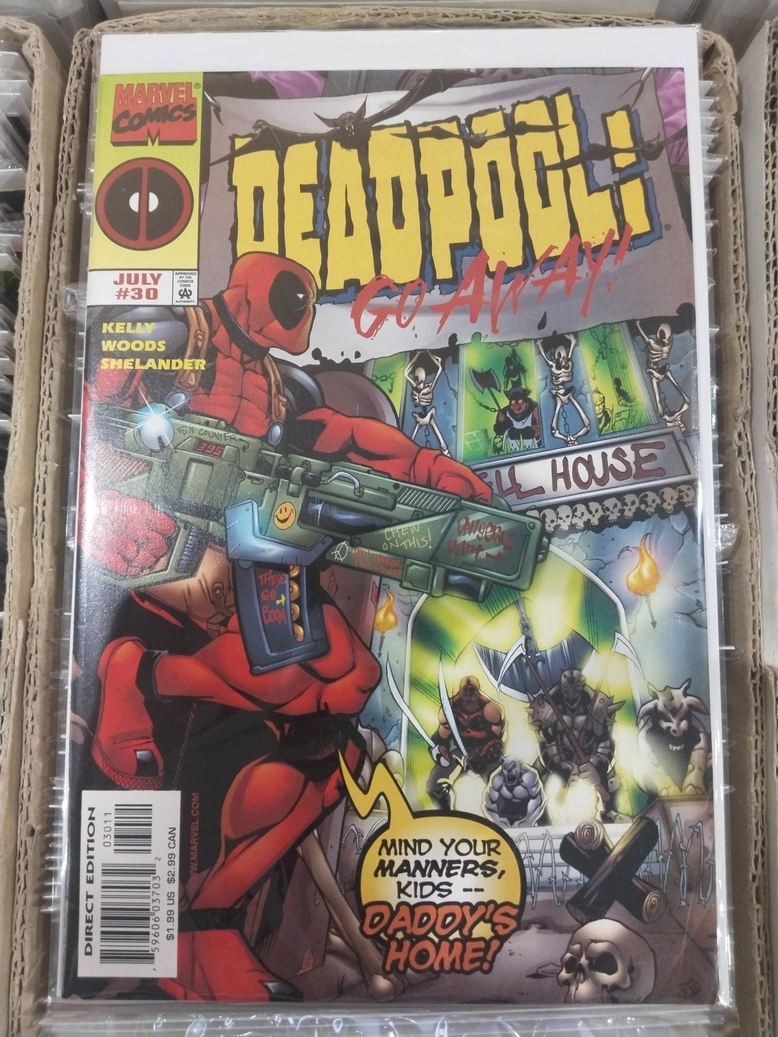Deadpool issue #30 from Marvel Comics, published in July 2000. Written by Kelly and Woods with artwork by Shelander. This comic features Deadpool with a weapon on the cover and the tagline 'Go Away!'. It is a direct edition and is in protective casing. No grade information available.