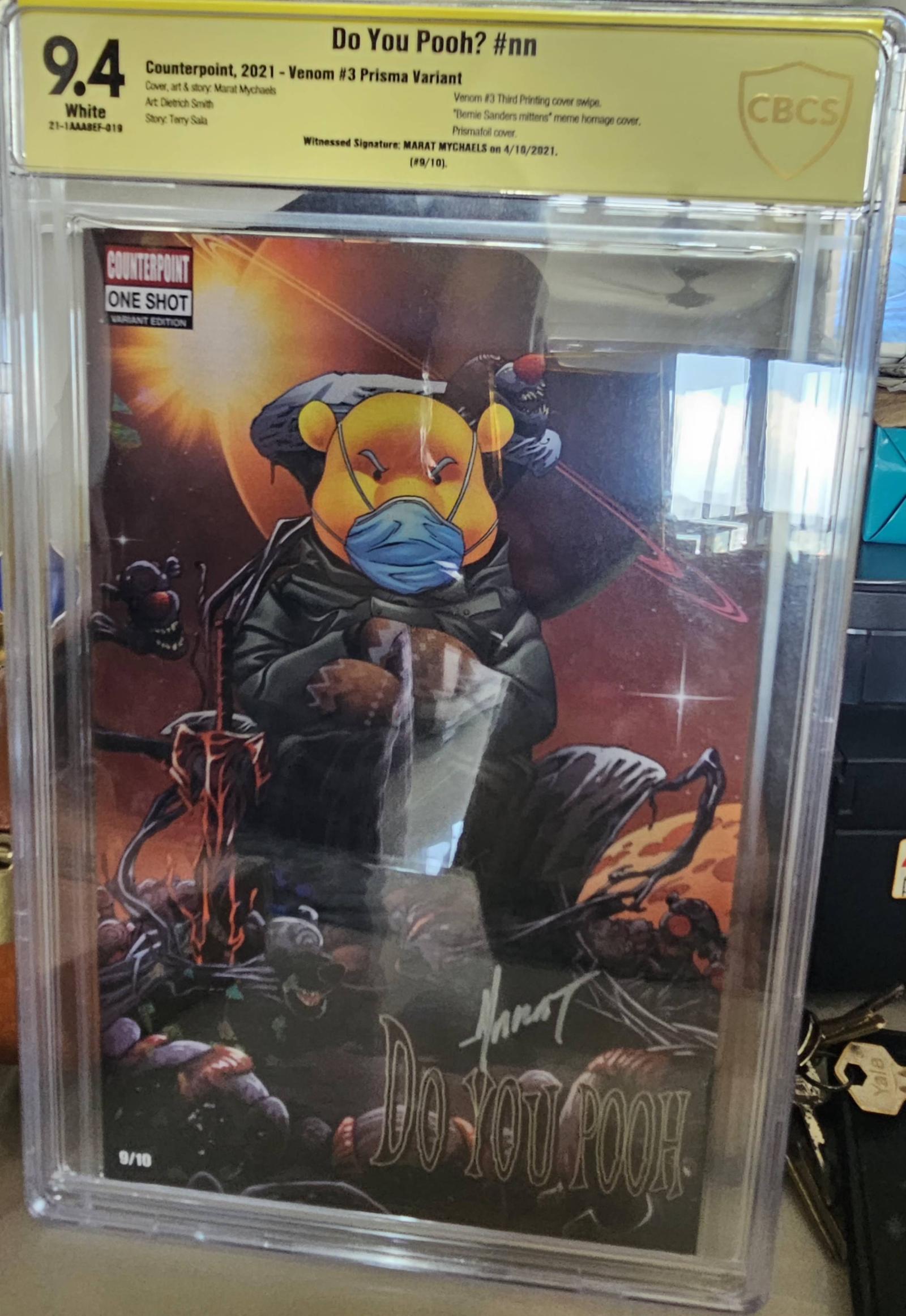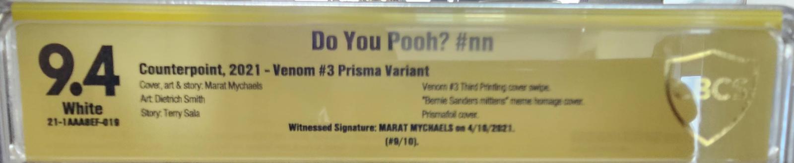 Counterpoint's 2021 Venom #3 Prisma Variant titled 'Do You Pooh?' features cover art, story, and art by Marat Mychaels, with art from Dietrich Smith and story by Terry Sala. This comic is a third printing cover swipe and a 'Bernie Sanders mittens' meme homage cover. It is a prismfoil cover, witnessed signed by Marat Mychaels on 4/16/2021, and is graded 9.4 by CBCS with white pages. This variant is numbered 9/10, making it a rare collectible.